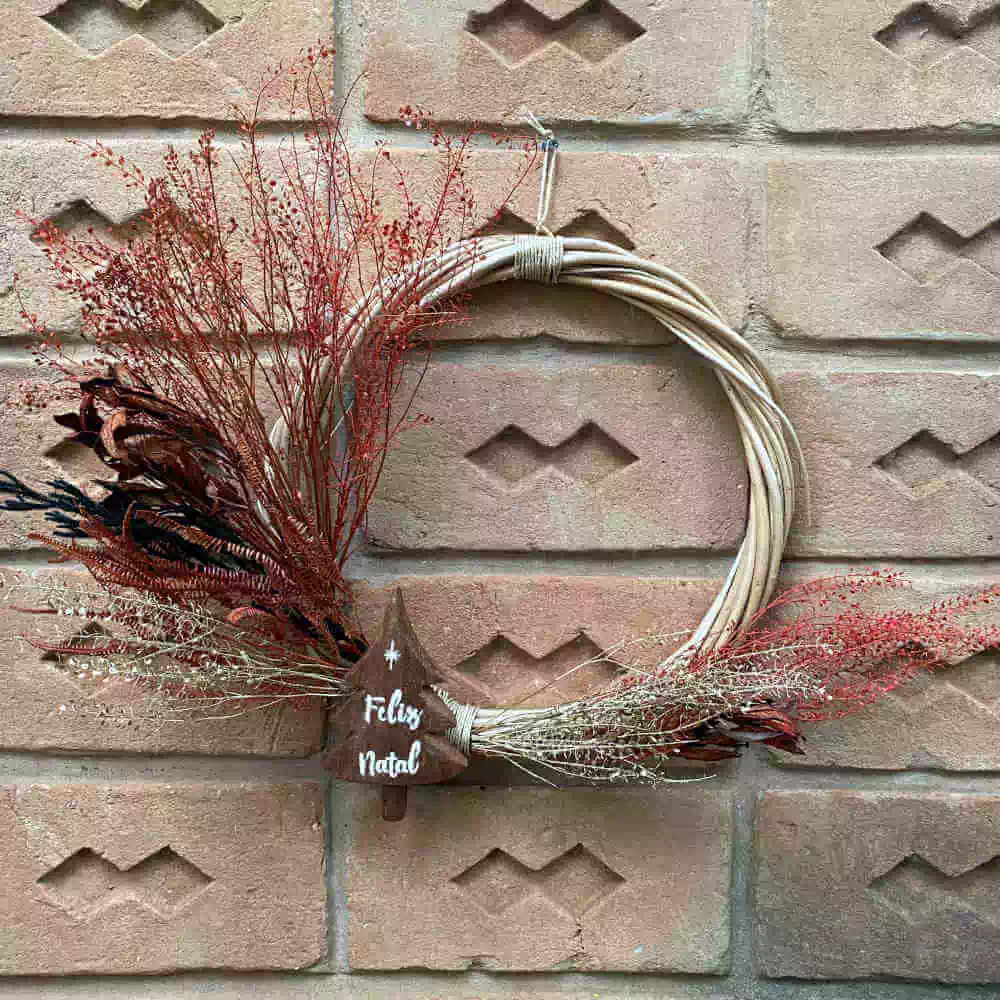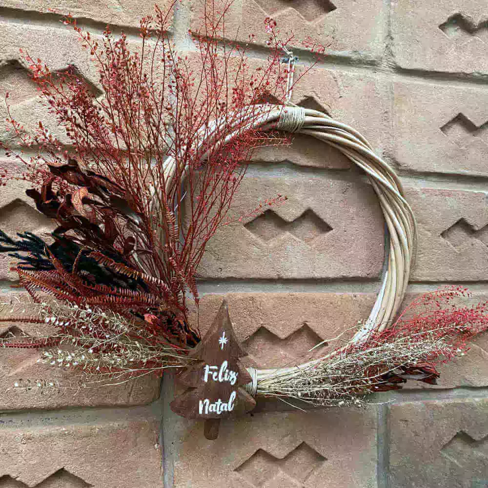 Guirlanda com base de vime e e folhagens secas nos tons tradicionais do natal, vermelho, verde escuro e dourado.