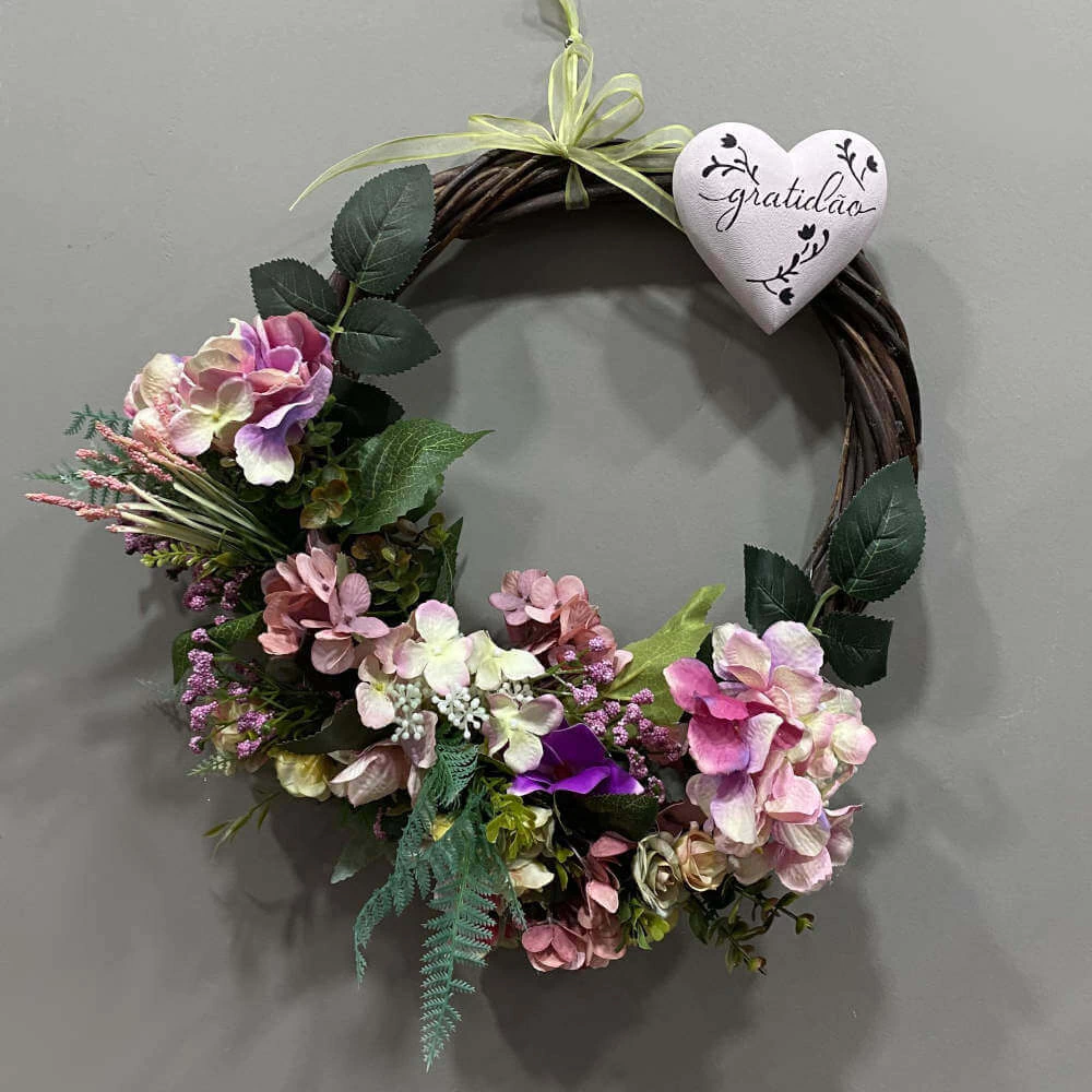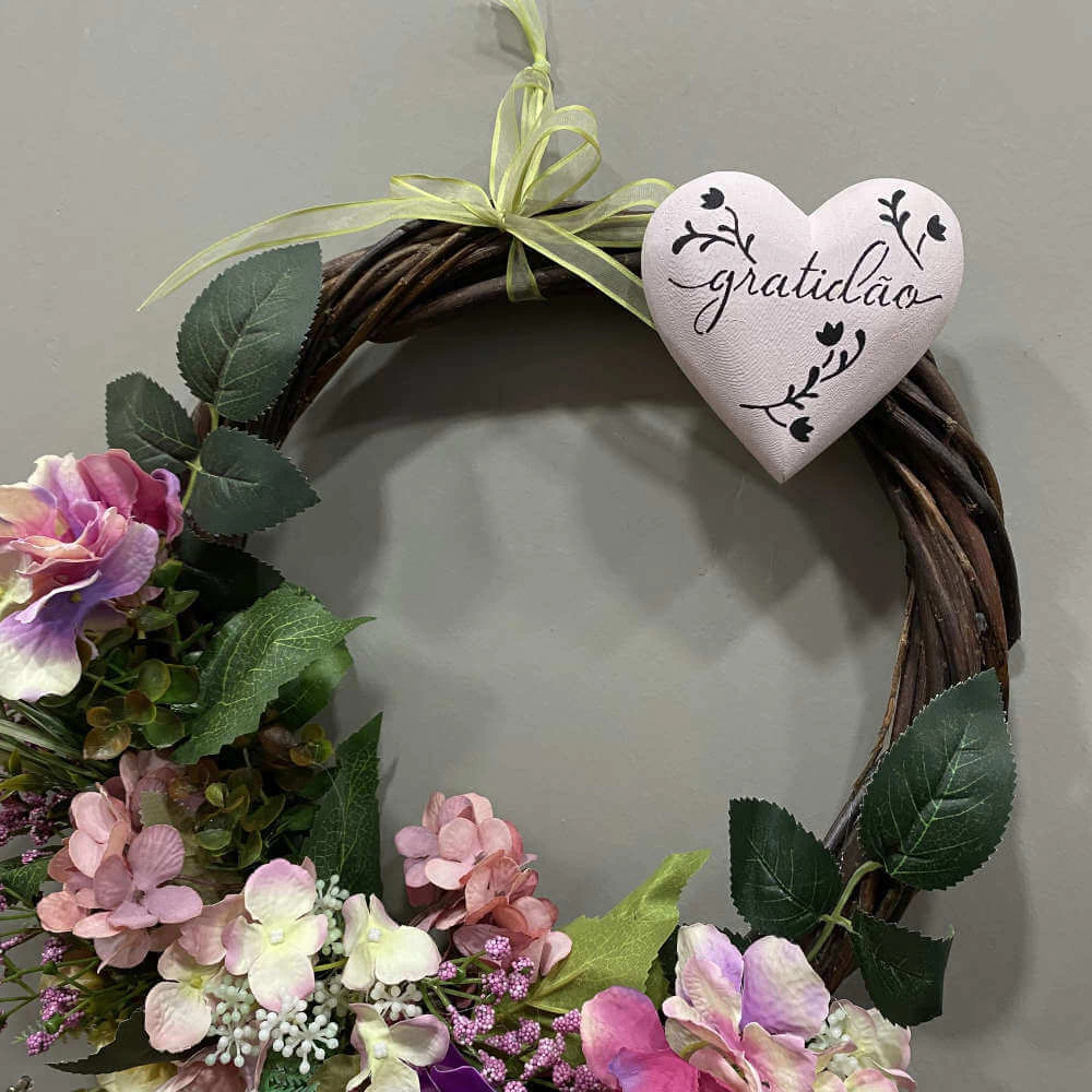 A base é feita de vime, destaque para o coração em madeira com a palavra GRATIDÃO esculpido e pintado a mão.