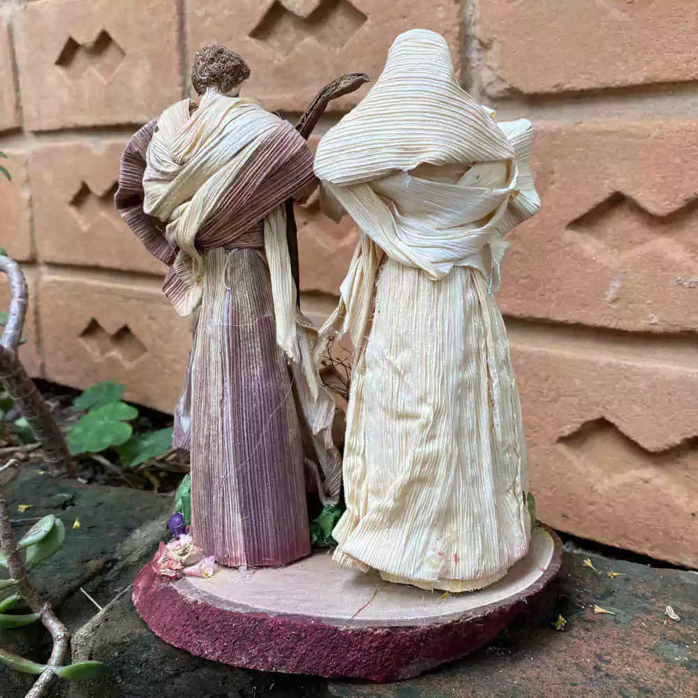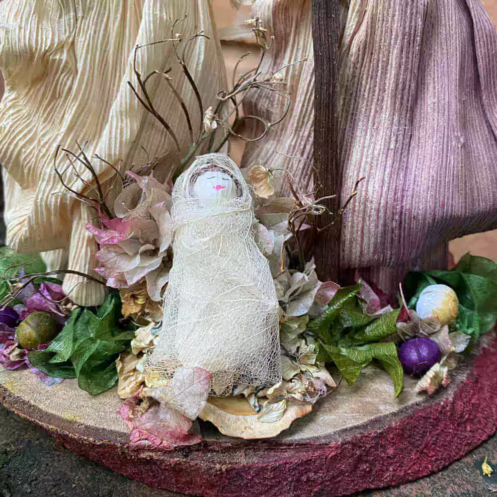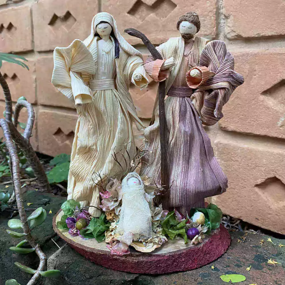 A tradicional Sagrada Família em uma versão artesanal em palha de milho, galhos e flores secas.