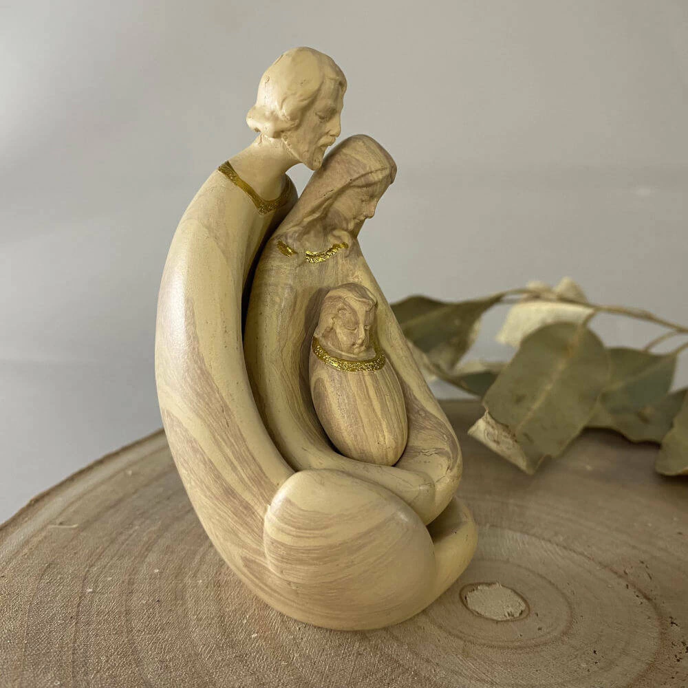 Feita em resina essa Sagrada Família tem acabamento que imita madeira, as linhas são os contornos de Maria e José amparando o menino Jesus.
