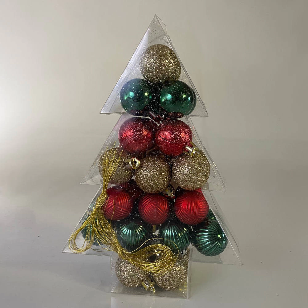 Este kit de bolinhas natalinas traz a essência do Natal em sua forma mais clássica. Acompanha uma caixinha em formato de árvore de Natal, ideal para presentear ou organizar sua decoração com praticidade e beleza.