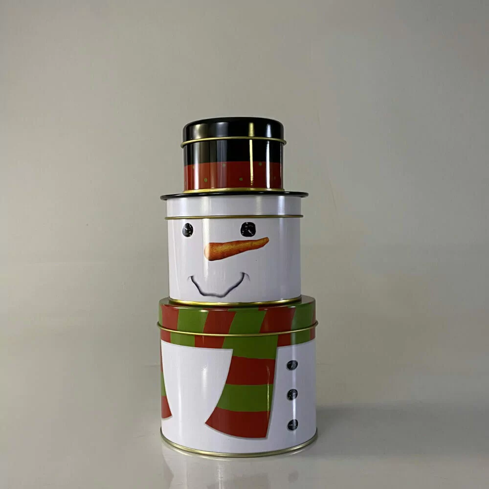 Boneco de neve em formato de lata, ele é sepadaro em 3 partes onde você pode colocar três tipos de doce ou biscoitos diferentes.