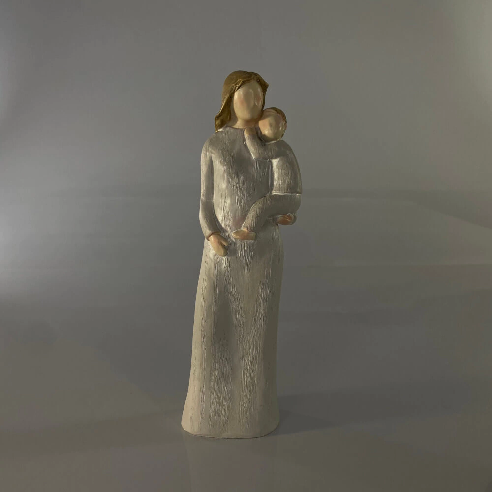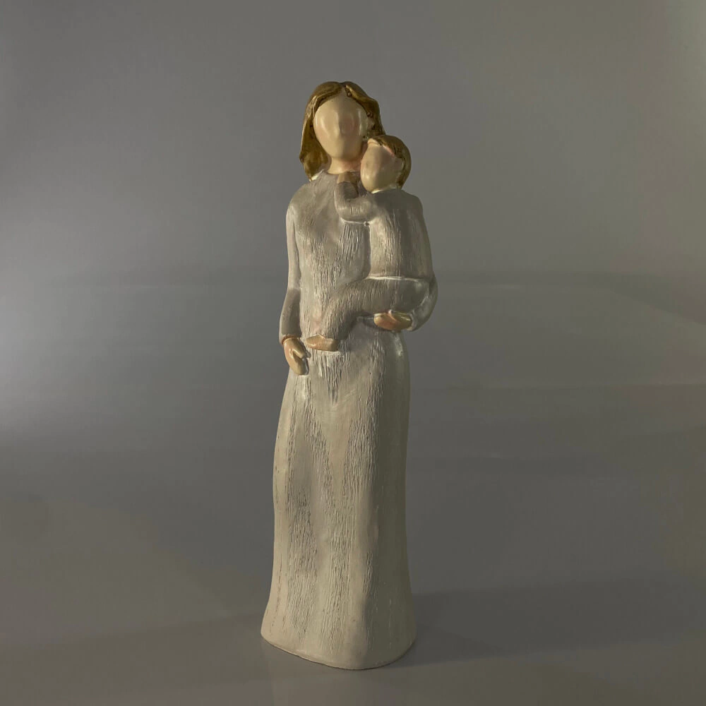 Uma peça decorativa delicada de uma mãe segurando seu filho no colo.