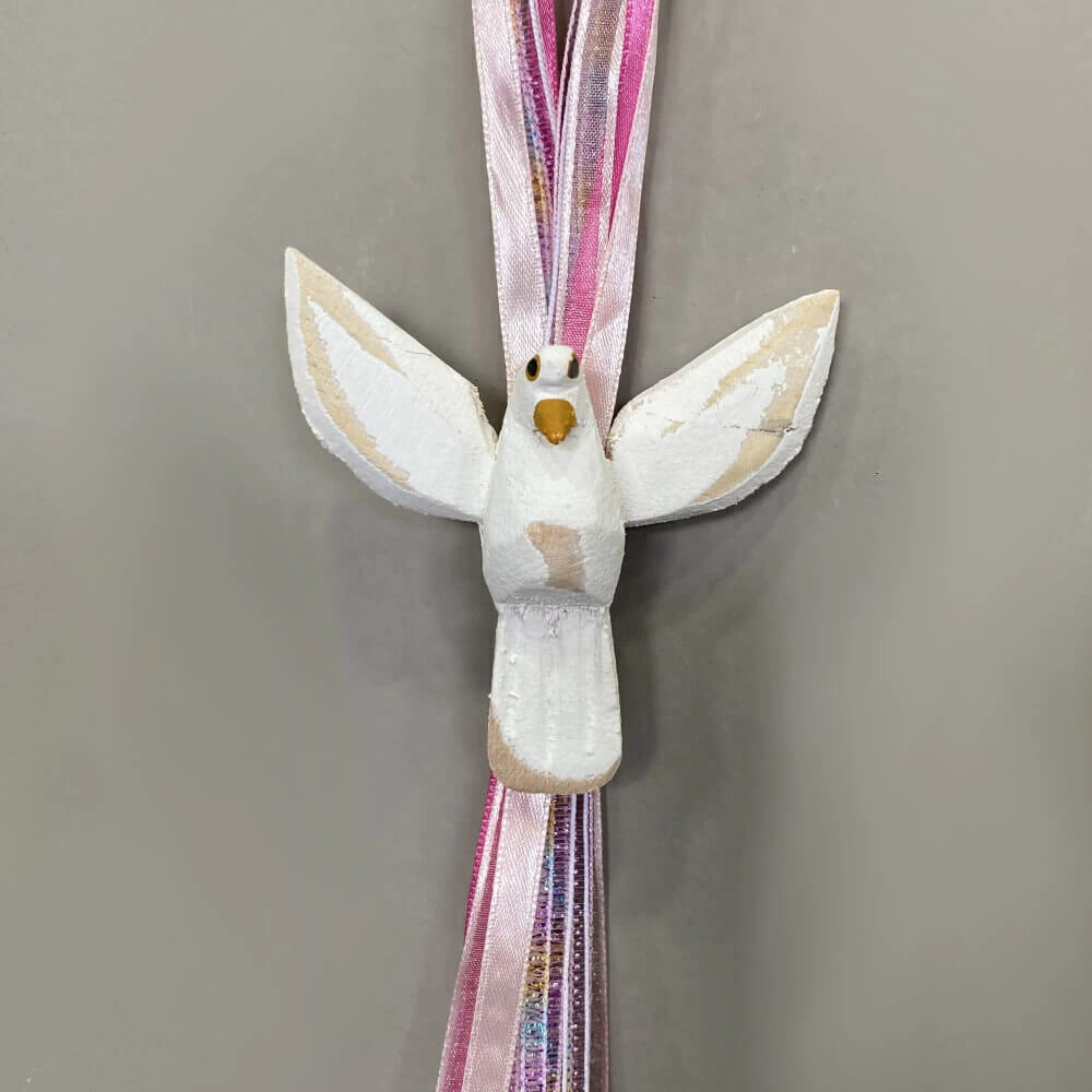 Espírito Santo branco em madeira com fitas em tom de cor-de-rosa.