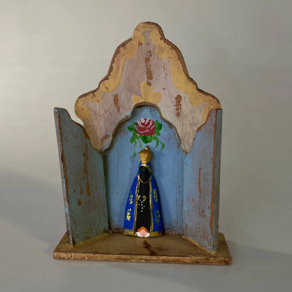 Mini capelinha estilo barroco em madeira com Imagem de Nossa Senhora Aparecida.