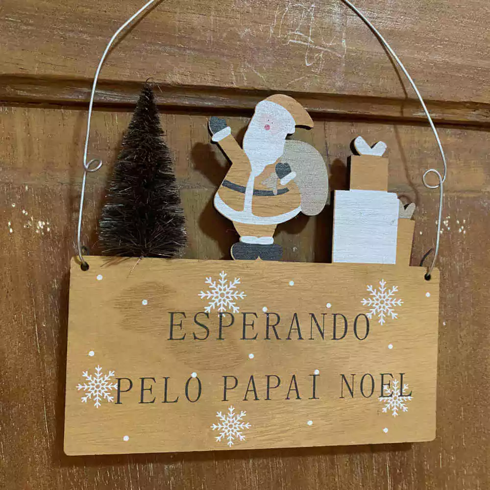Com a frase " Esperando Pelo Papai Noel" esse enfeite é em madeira e uma ótima opção para uma lembrança de natal.