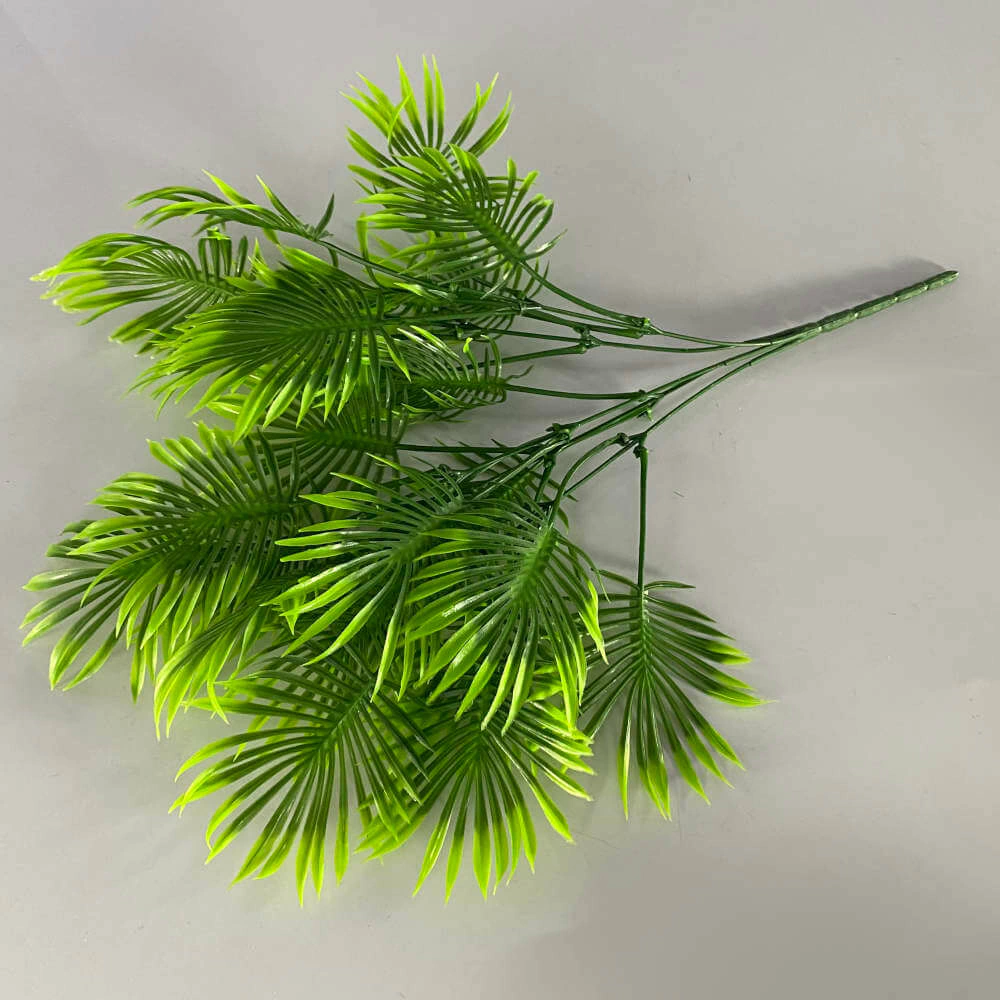 Folhagem artificial imitando galho de mini palmeira.
