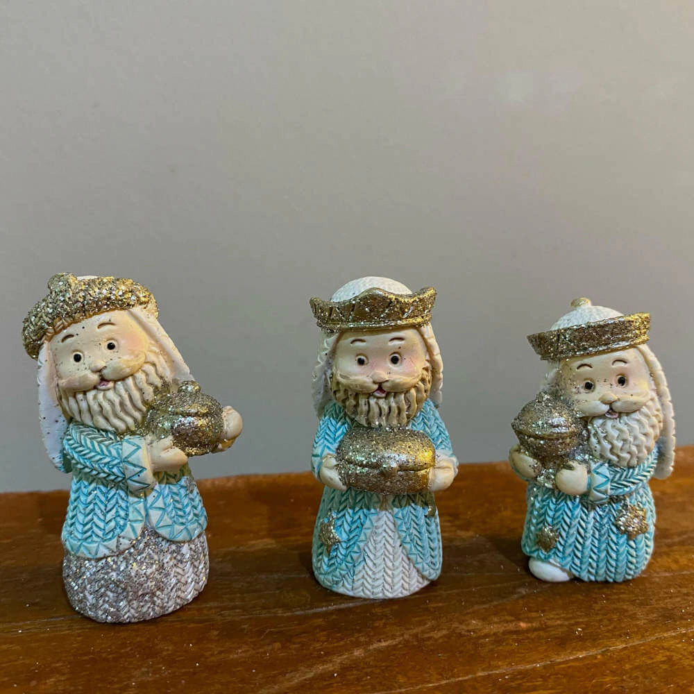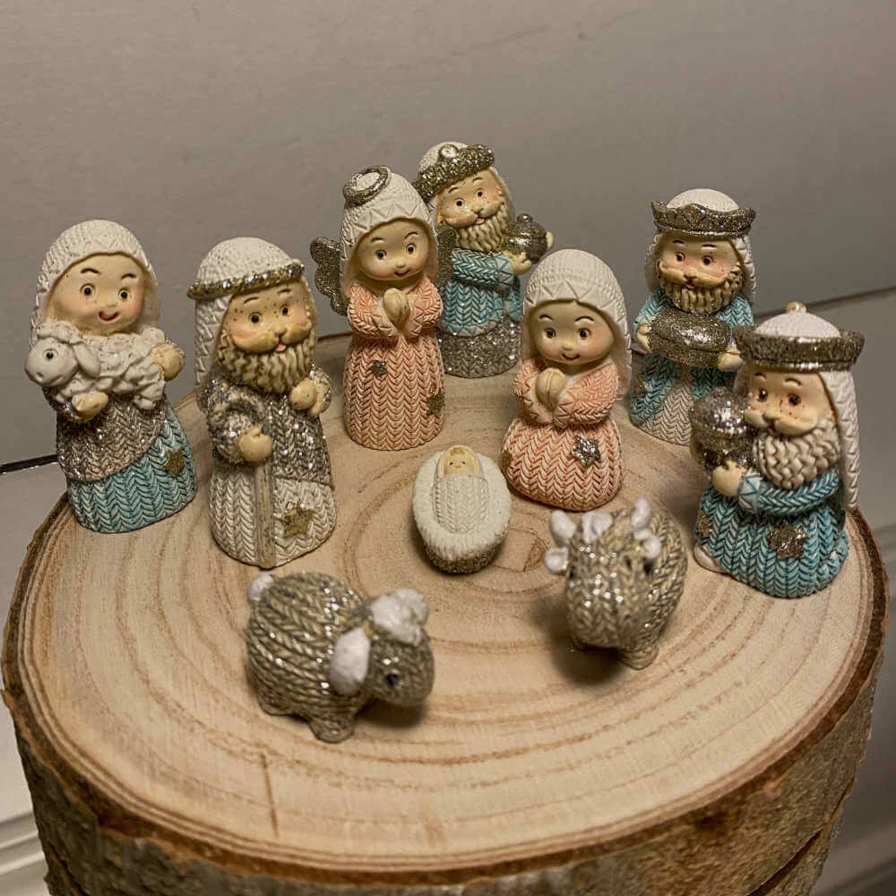 Ele possui 10 peças. Maria, José, menino Jesus, 3 reis magos, anjo, pastor e 2 animais.