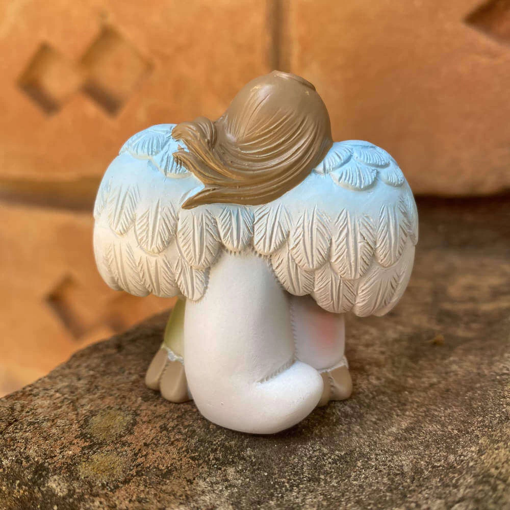 Mini presépio feito de resina com Jesus, Maria e José protegidos por um abençoado anjo.