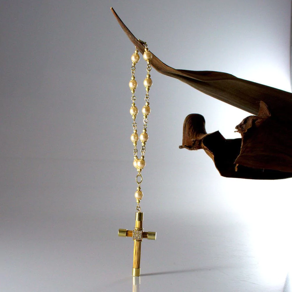 Material: metal com banho dourado. Pérolas sintéticas. Strass e capim dourado.