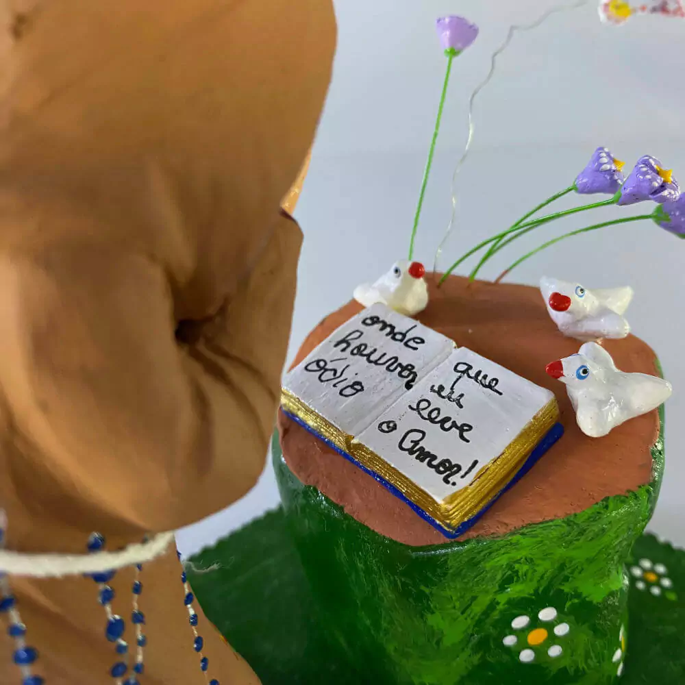 A imagem possui pombinhas voando, flores e o destaque para o livro onde está escrito uma parte da sua oração mais famosa:
