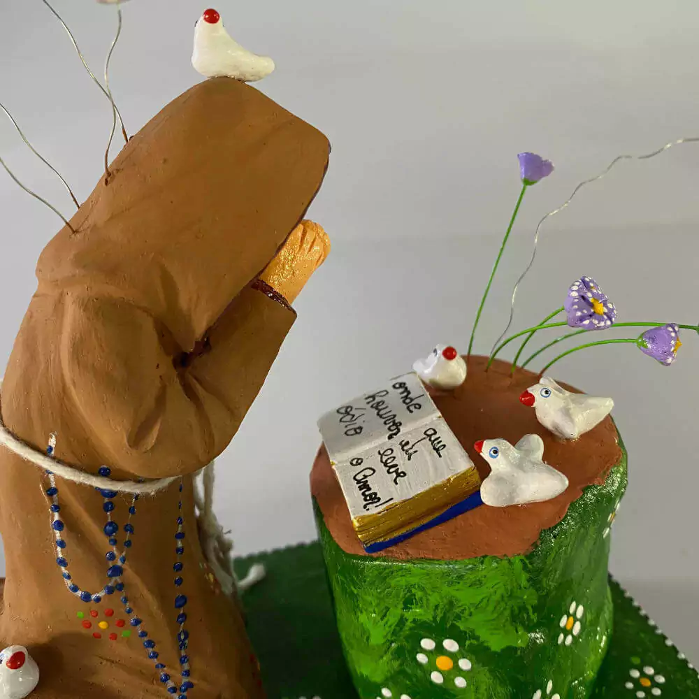 Dimensões: 18 cm de altura total com a pomba voando. 15 cm de altura até o pomba na cabeça de São Francisco. Base de 13x10 cm.