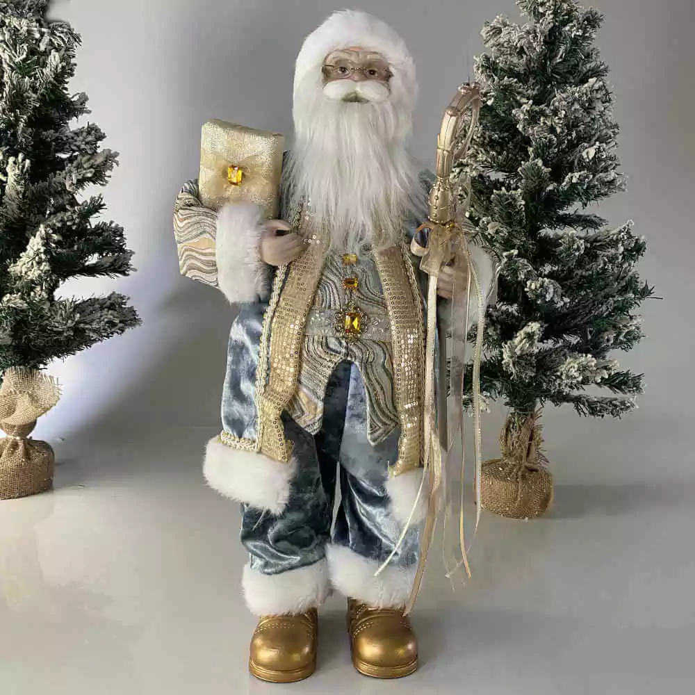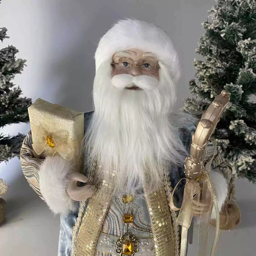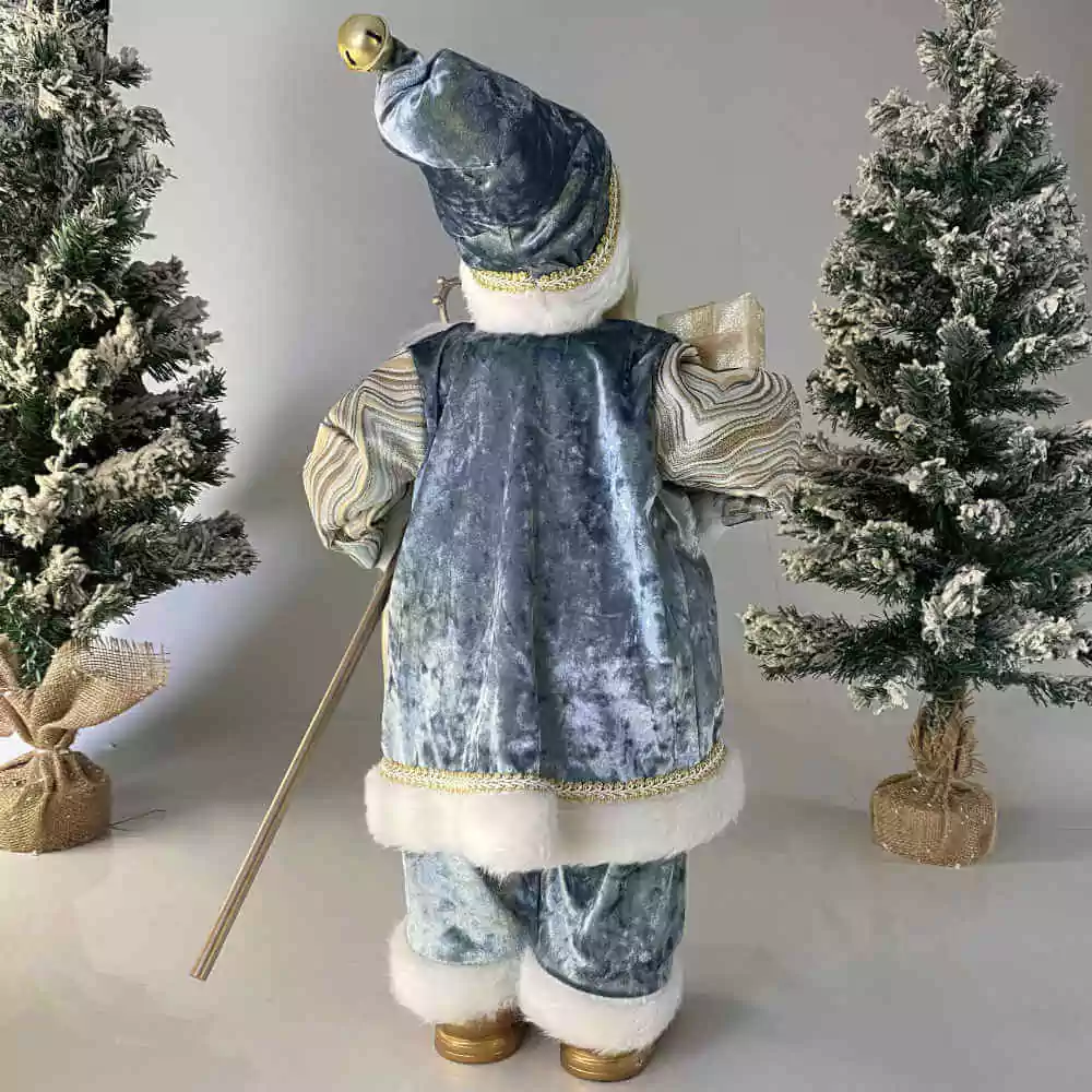 Papai Noel de 60 cm, lindo e luxuoso, com casaco e gorro de veludo azul, detalhes em prata e bbanco. Uma peça para tirar suspiros no natal!