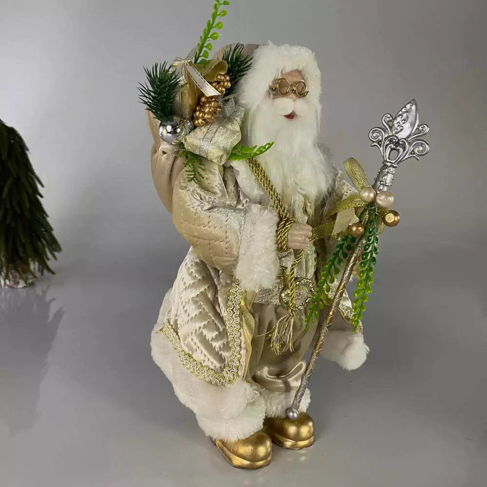 Papai Noel segura um cetro e um saco de presentes. Ideal para decorações em tons de branco, dourado ou champanhe.