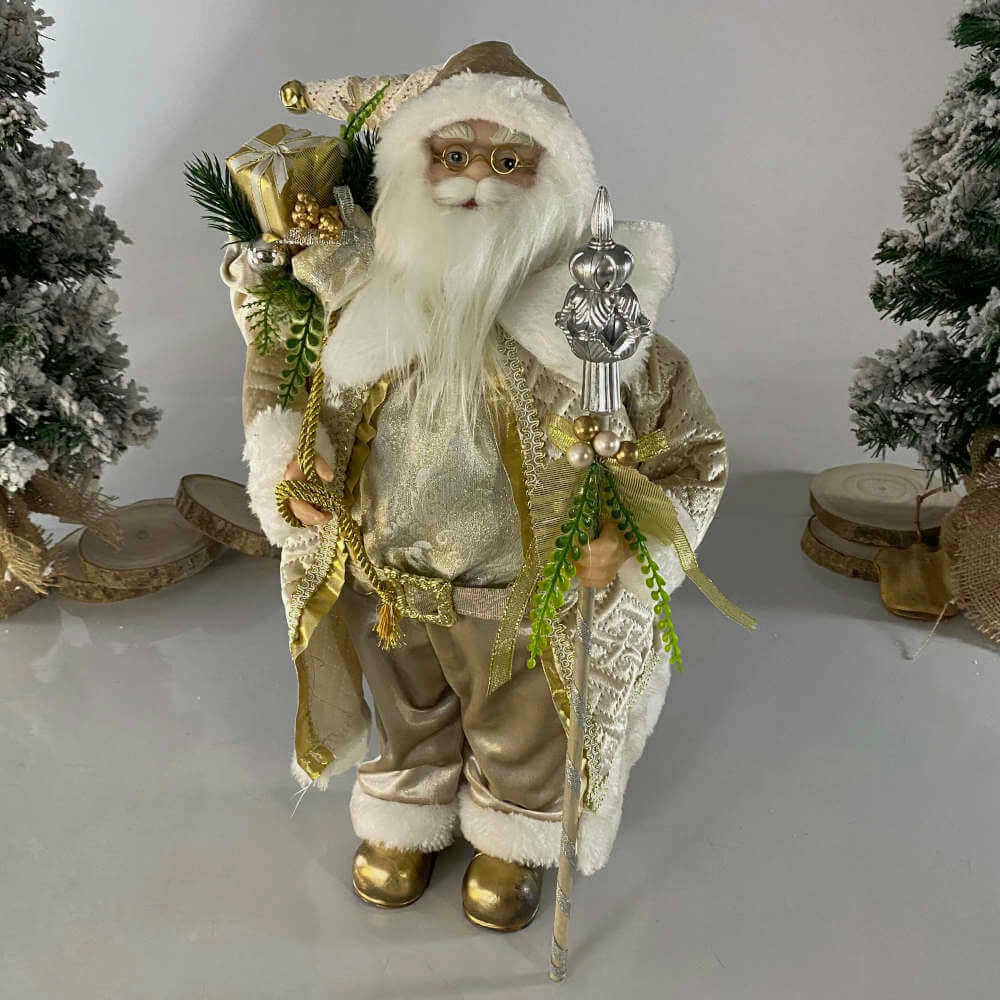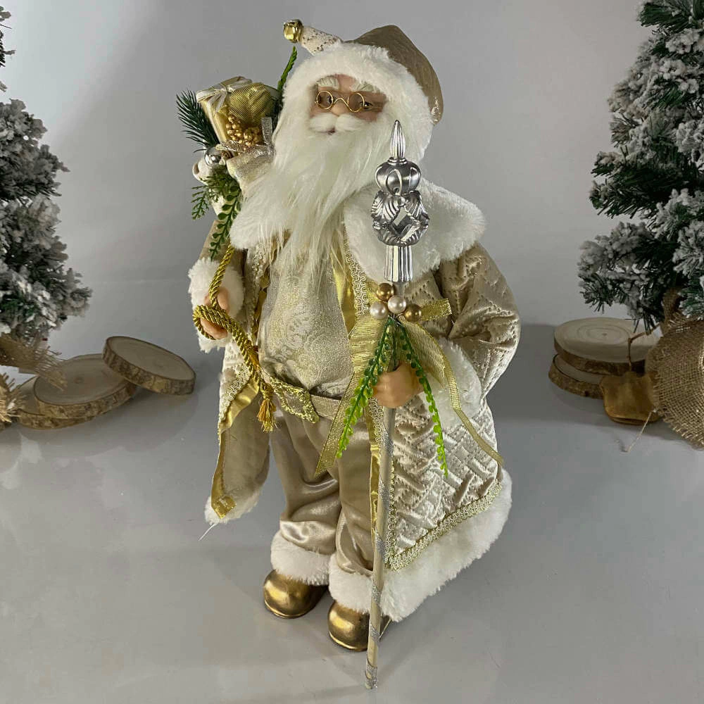 Senhor Noel com sua roupa de festa mais glamourosa. Em tons de branco, champanhe e detalhes em dourado.