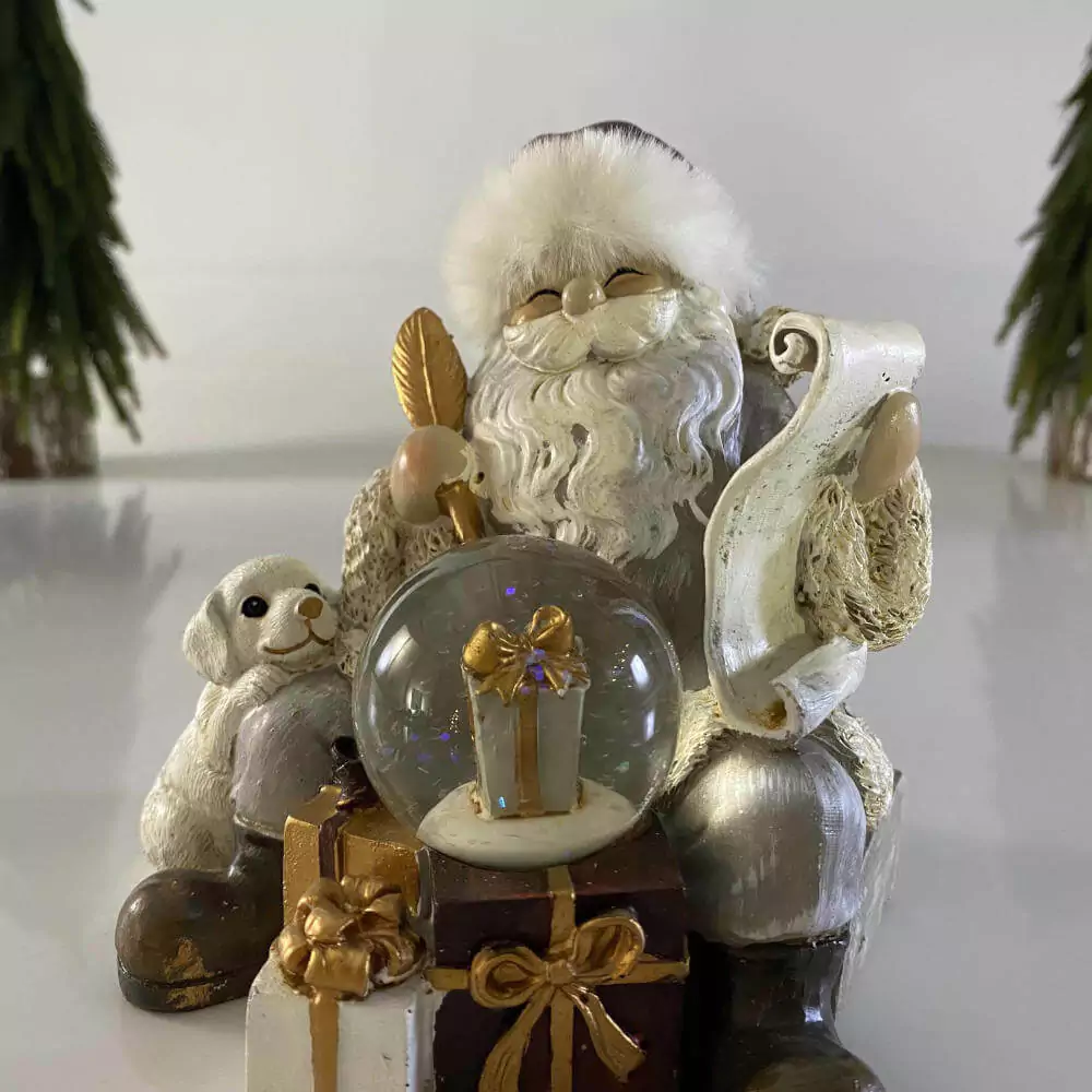 Feito em resina, com globo de neve com pequenos pontos de glitter, essa decoração de natal sai do tradicional. Tanto pela cor como pela feição do Noel.