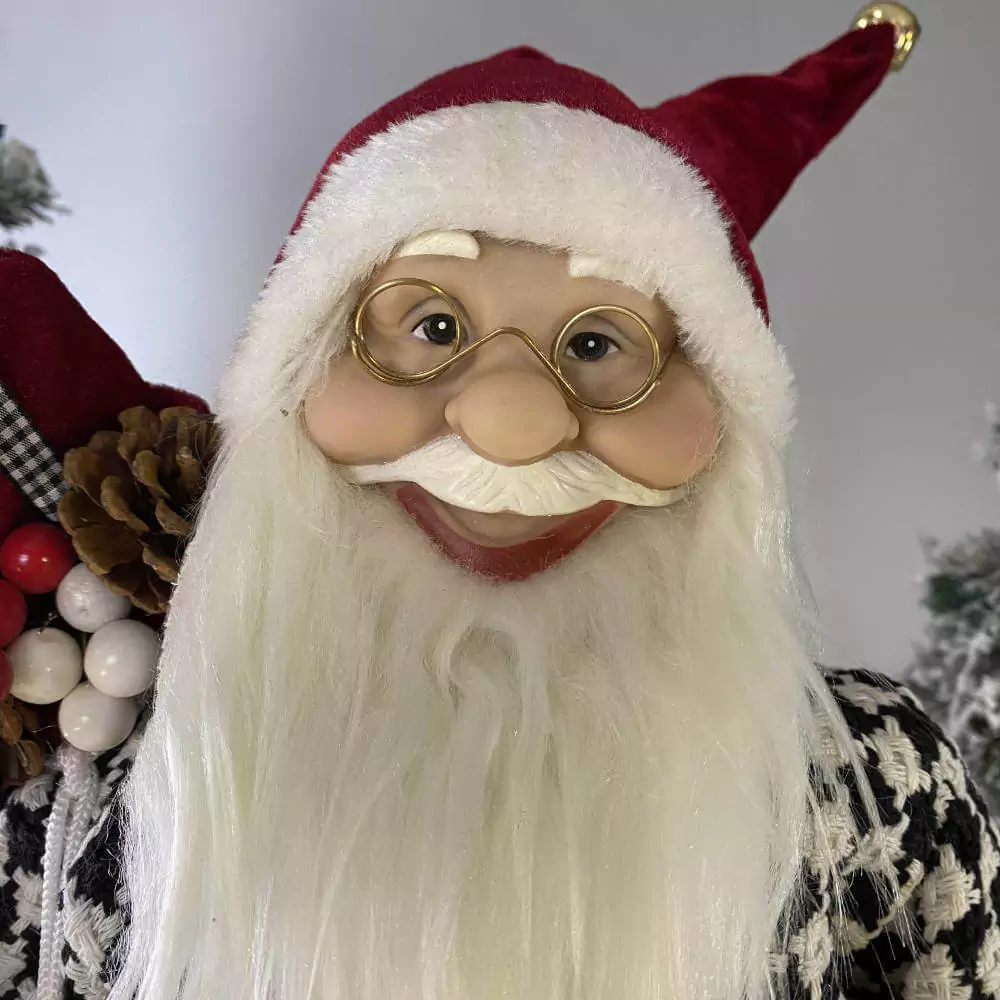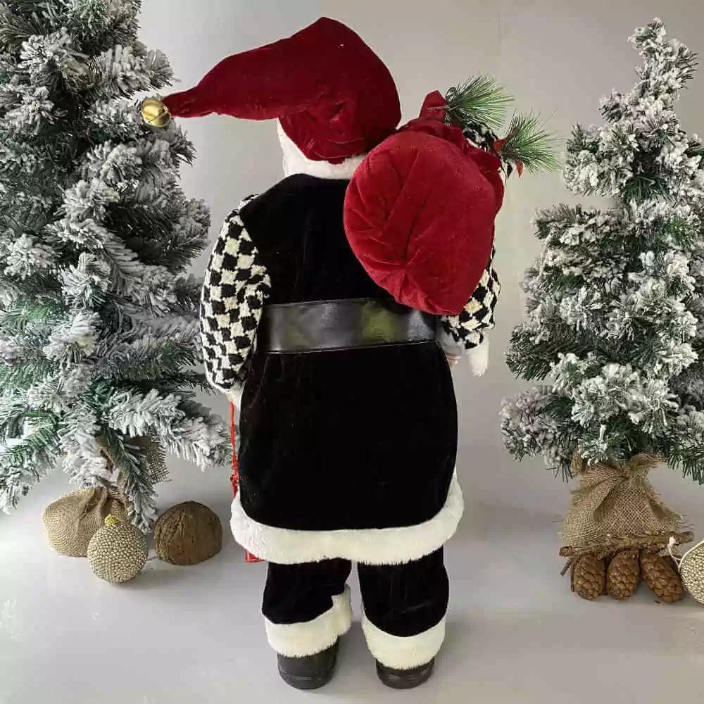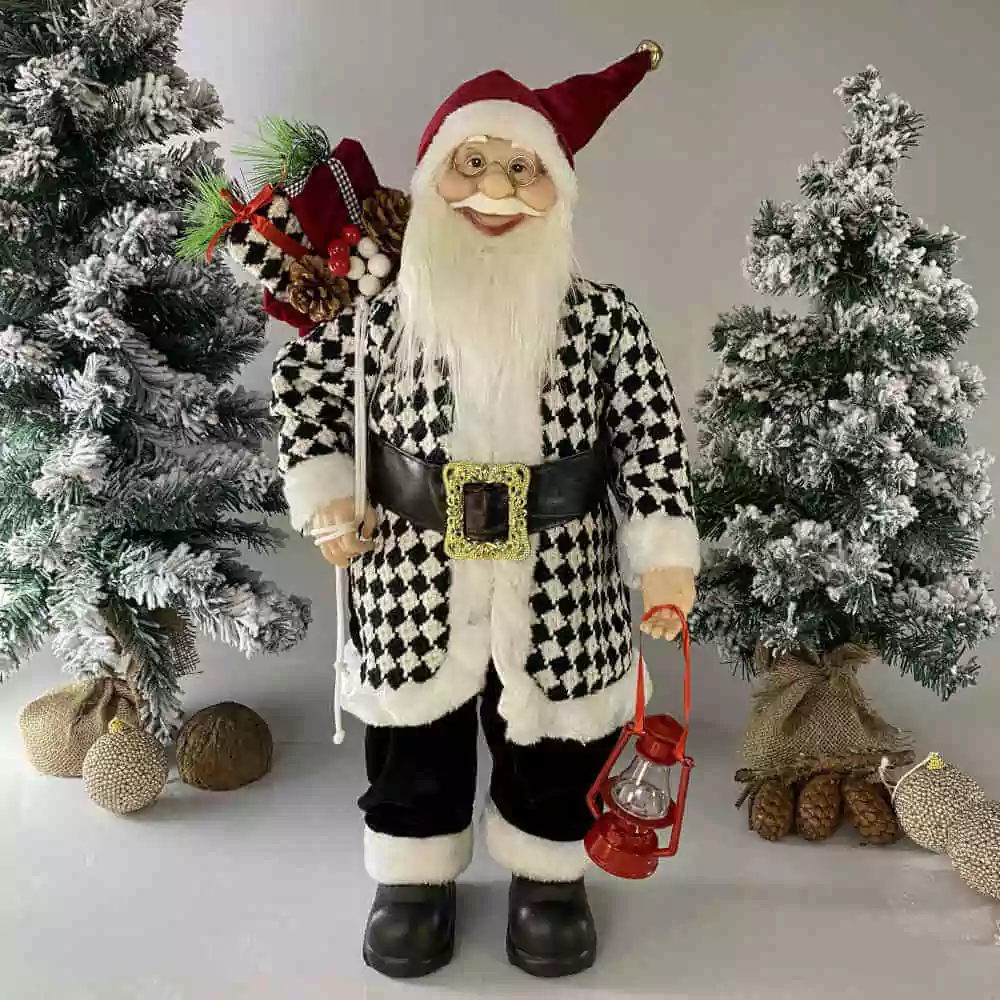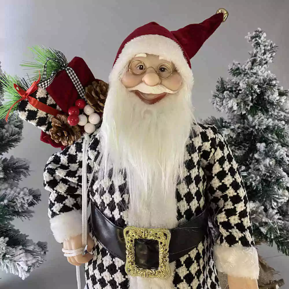 Com roupa xadrez, Senhor Noel veste um casaco branco e preto e uma calça de veludo preta. Contrastando com o gorro e o saco em vermelho, um charme.