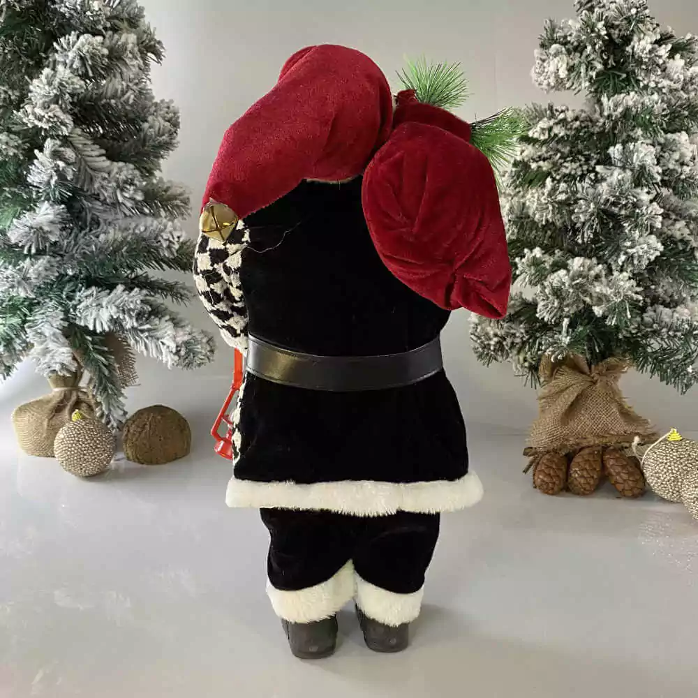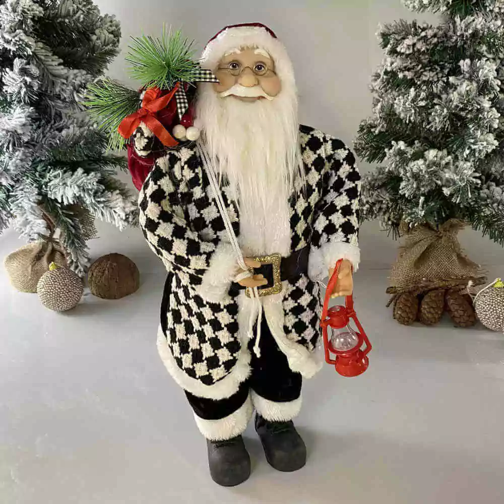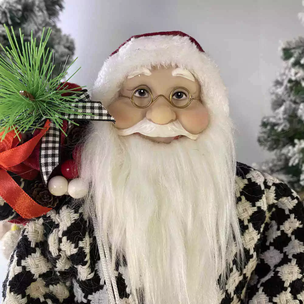Papai Noel estilo realista com roupa xadrez preta e branca e um lindo gorro vermelho.
