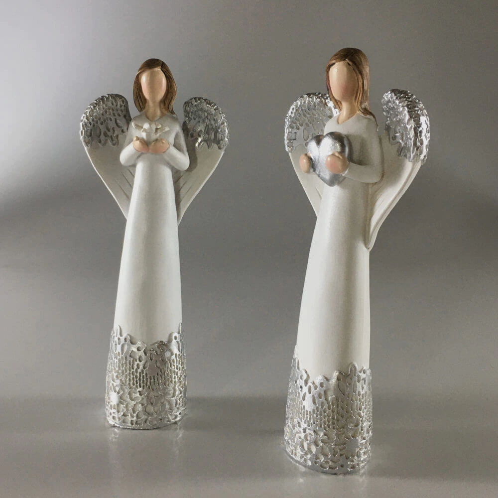 Anjos brancos, com trabalho em prata. Possuem textura na resina que imita uma renda, no final da roupa e ponta da asa.