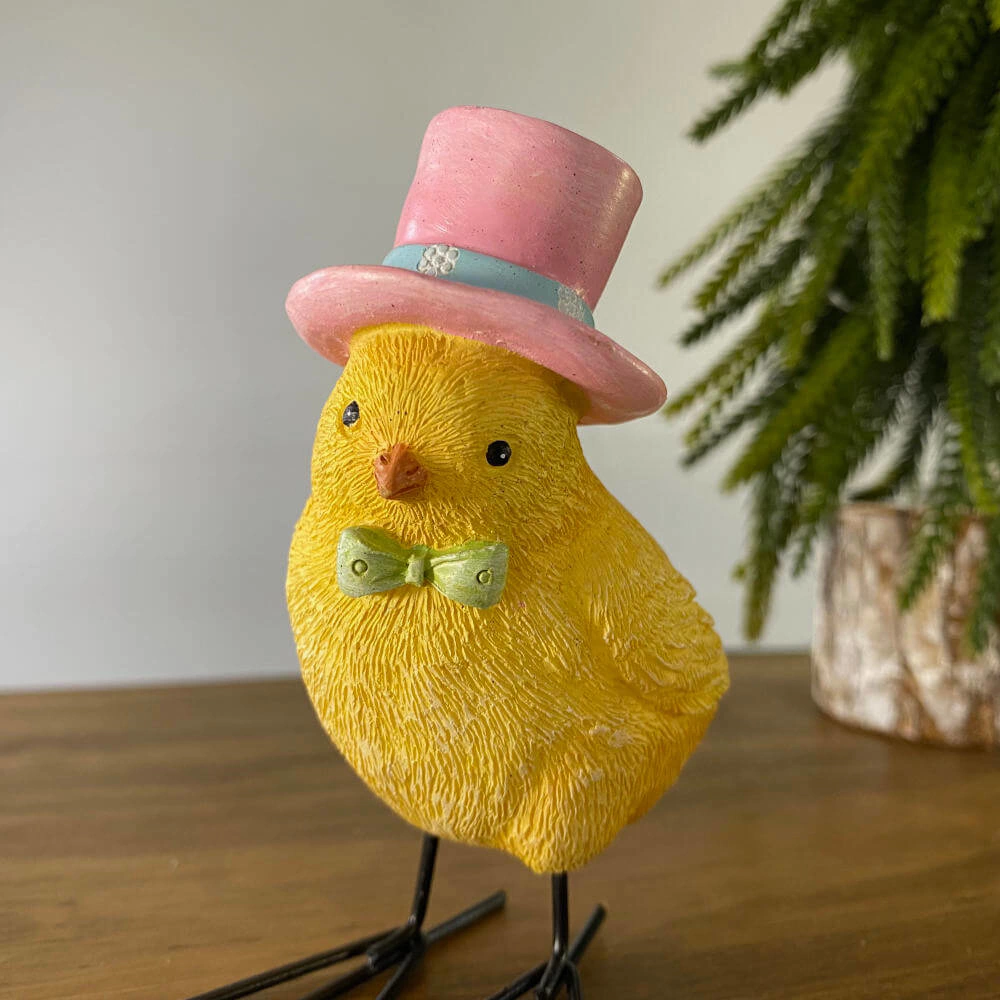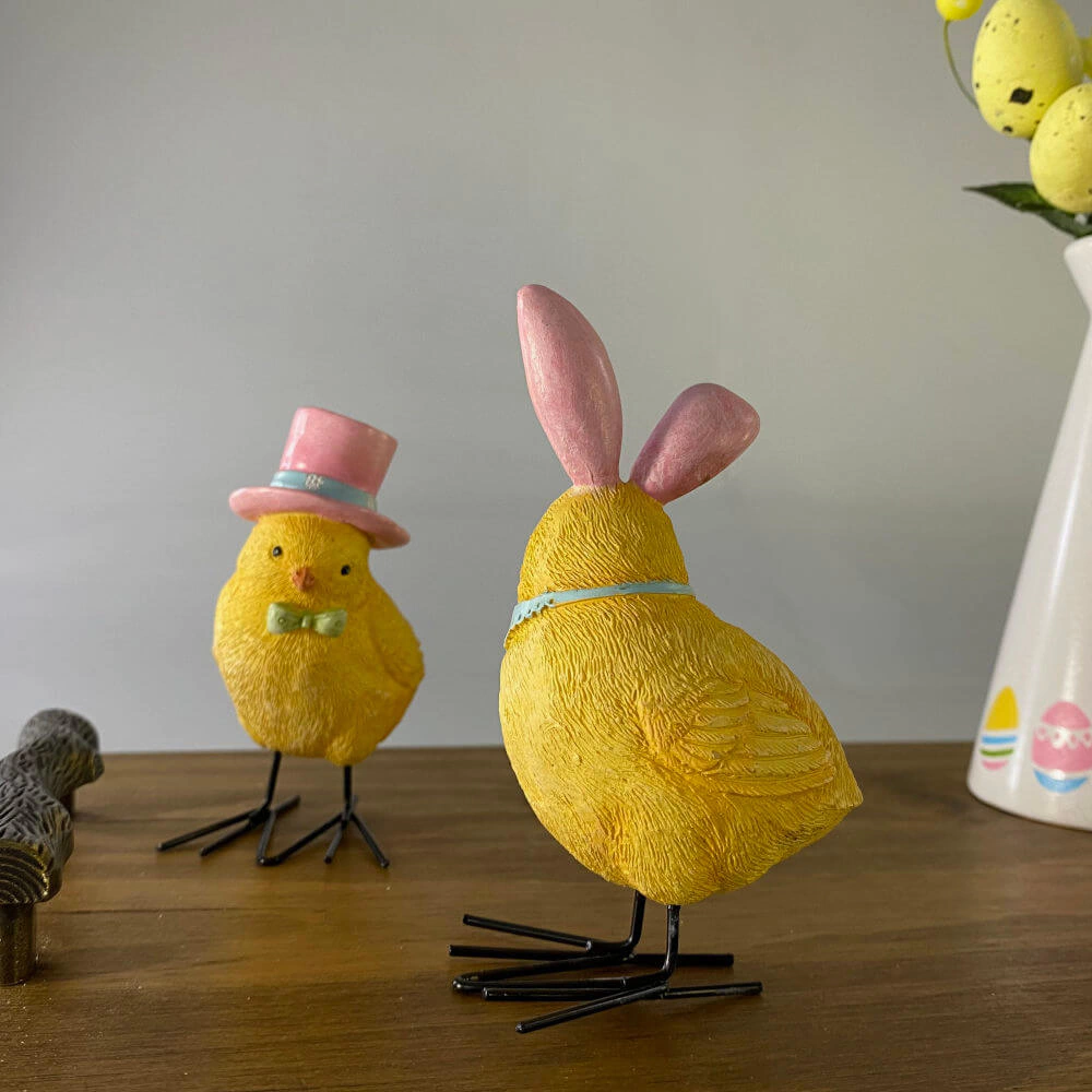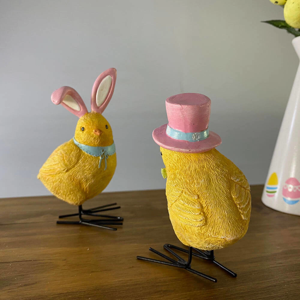 Par de pintinhos decoraticos com orelha de coelho e cartola cor-de-rosa.