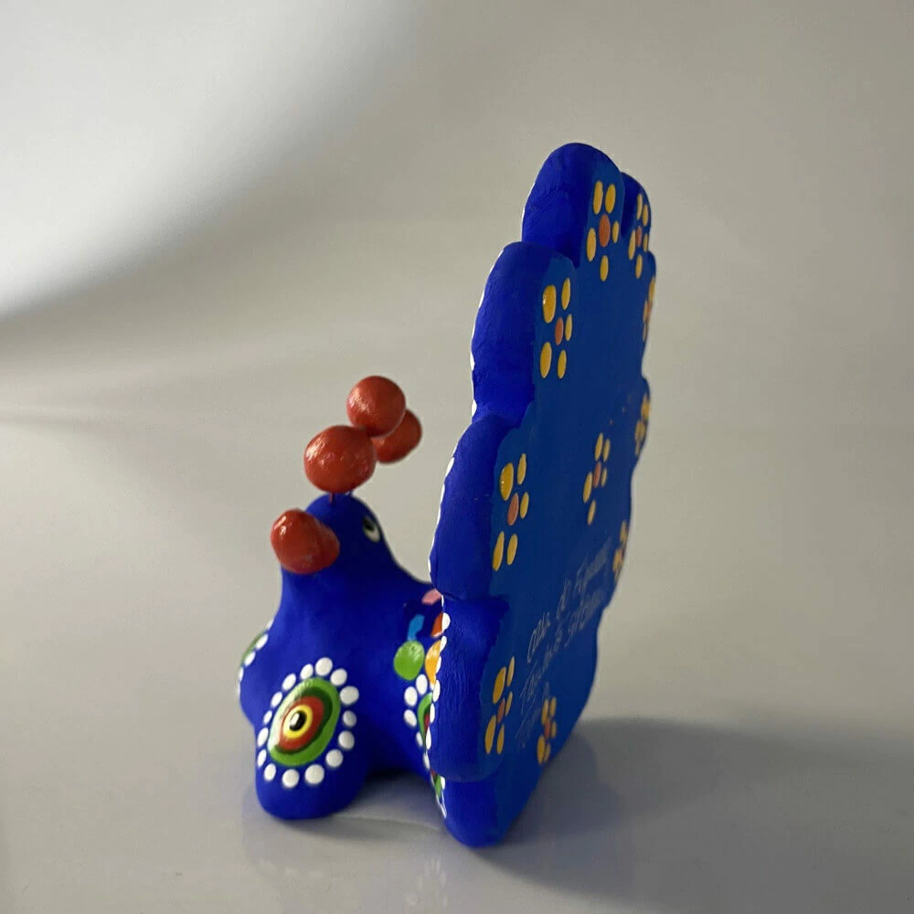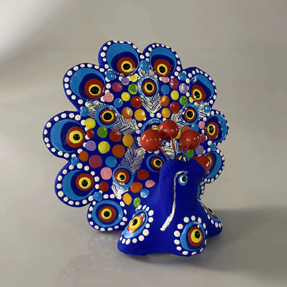 Pavão decorativo artesanal com pintura manual na cor azul.