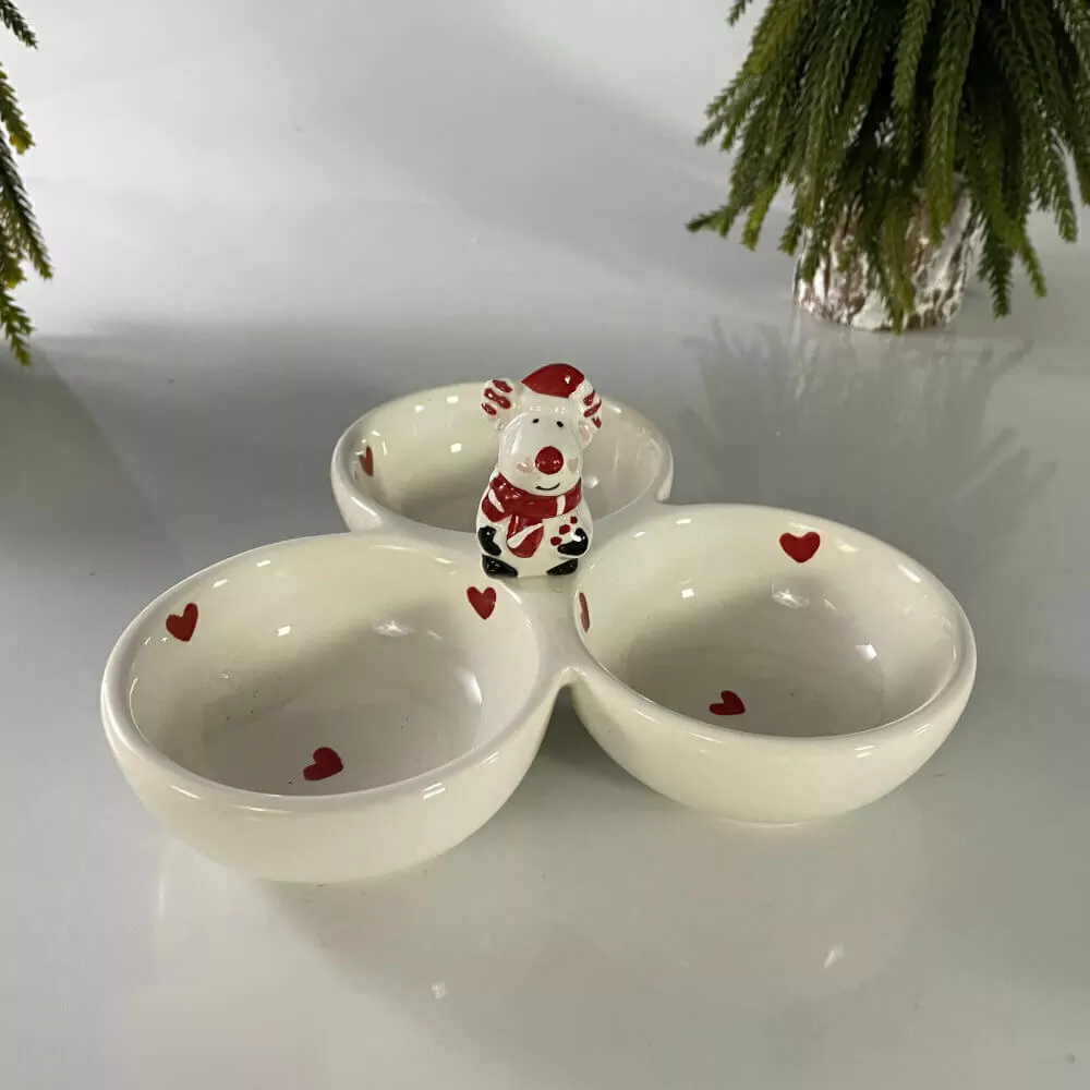 Petisqueira com três parte, rena natalina no centro e pequenos corações espalhados pela louça.