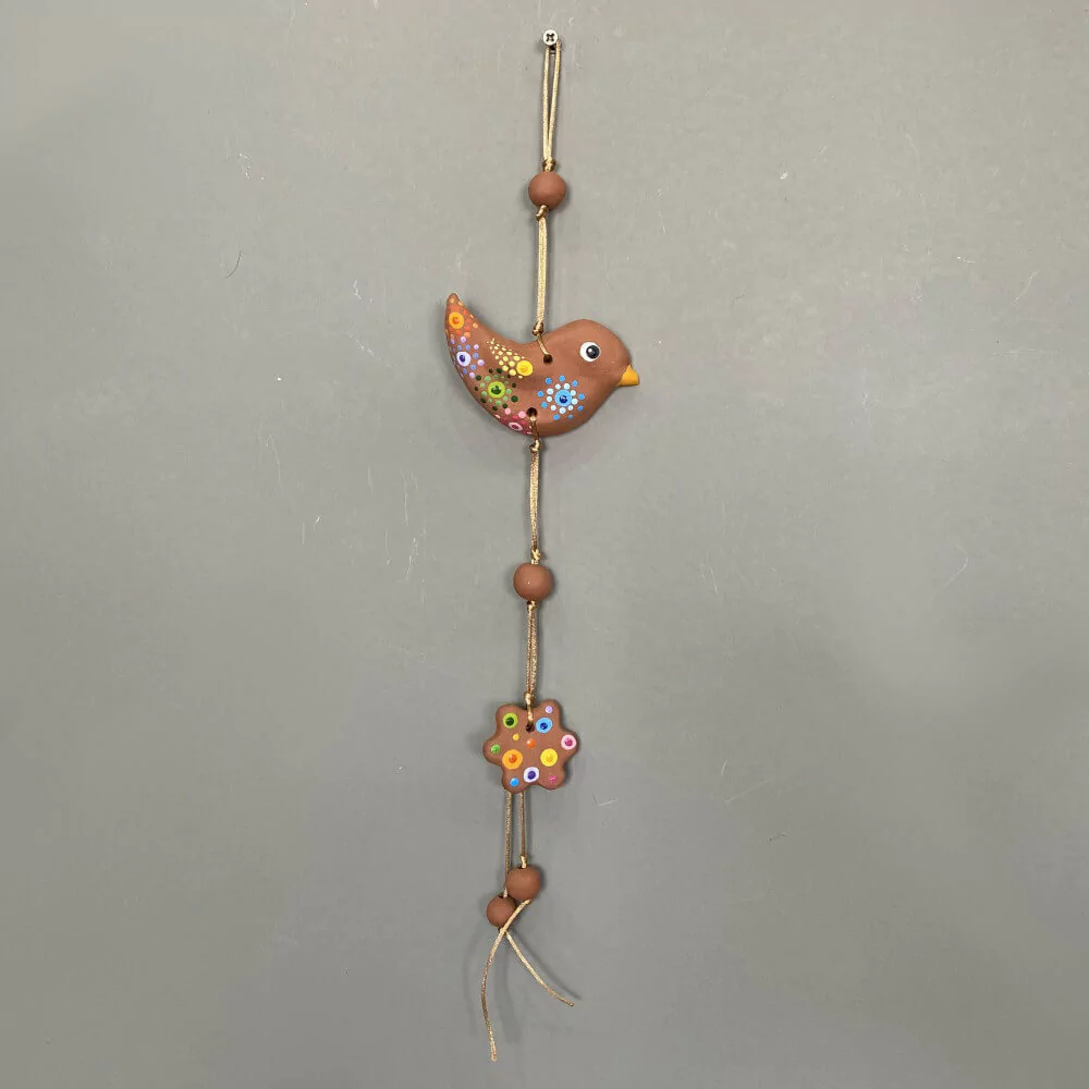 Dimensões: pássaro 8 cm x 5 cm. Flor 4 x 4 cm. Comprimento total do pingente 35 cm.