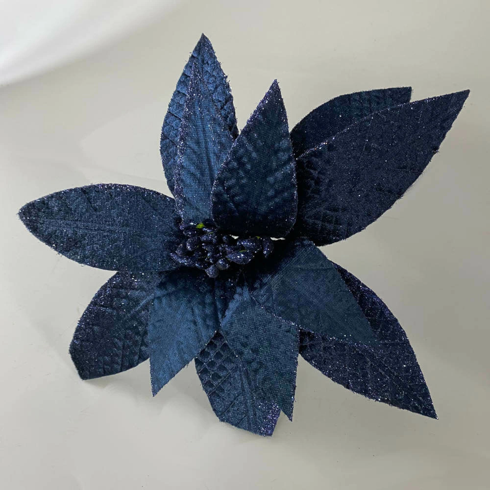Flor tipo poinsétia para decoração natalina na cor azul escuro.