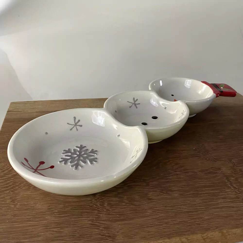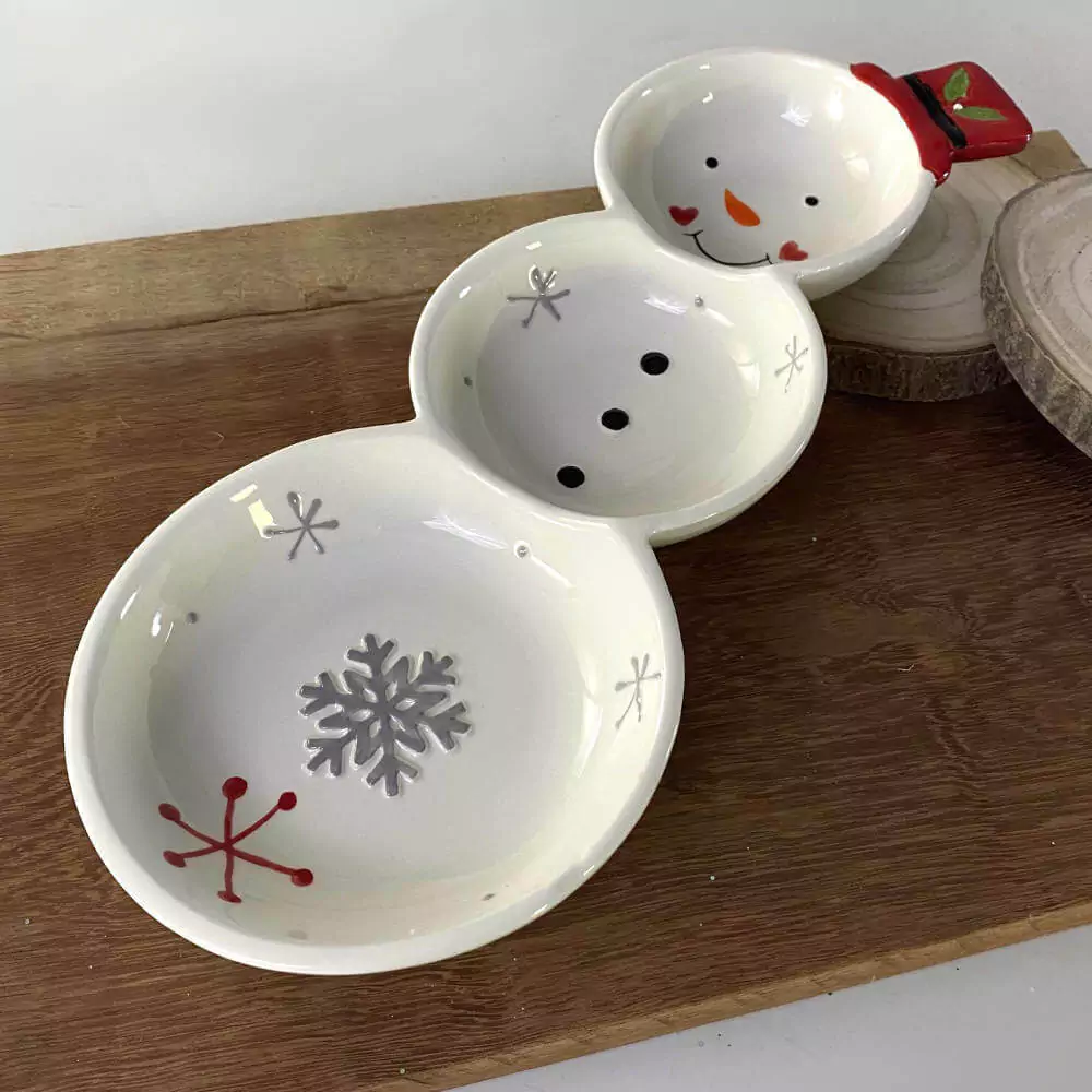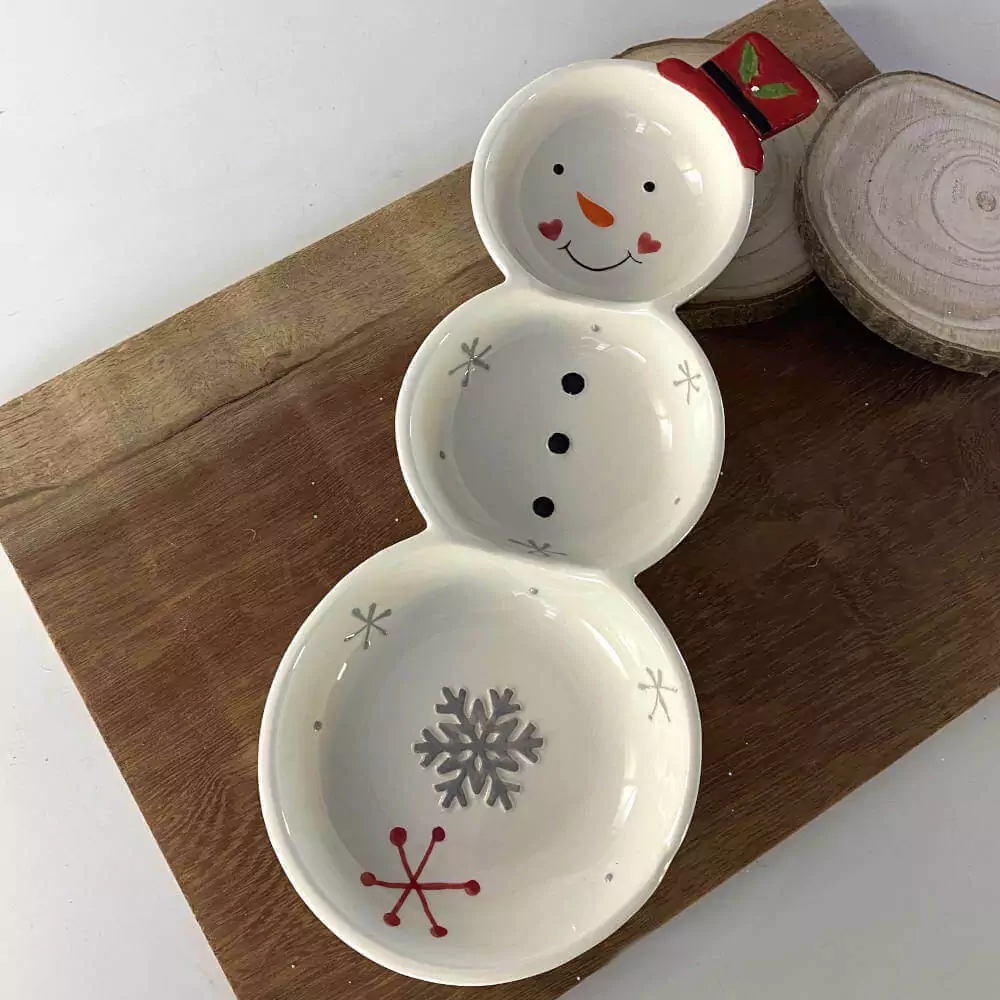 Prato decorativo em cerâmica no formato de um lindo boneco de neve.