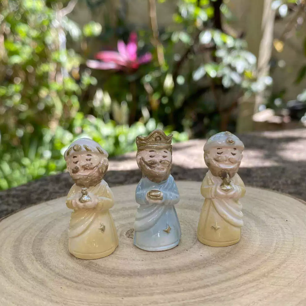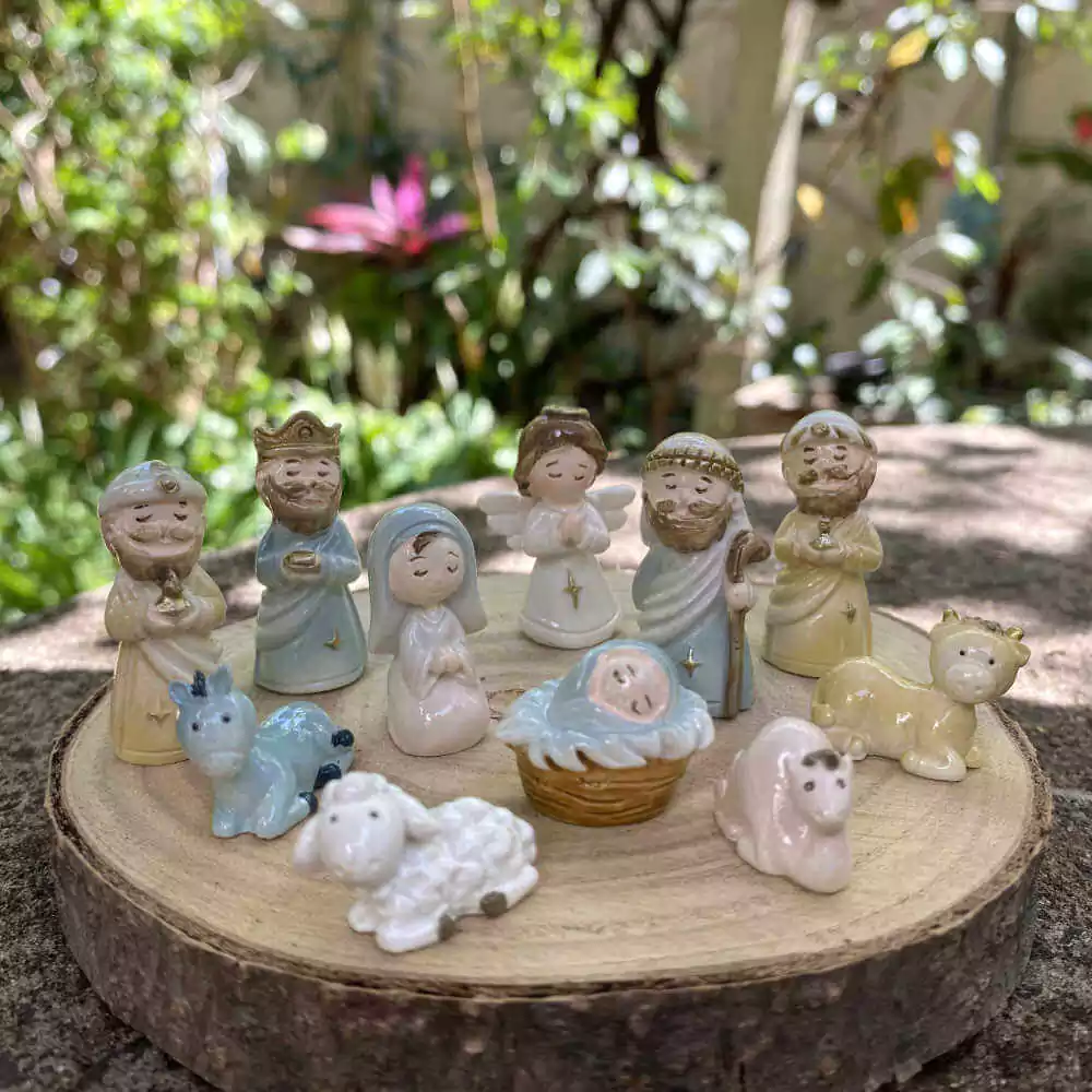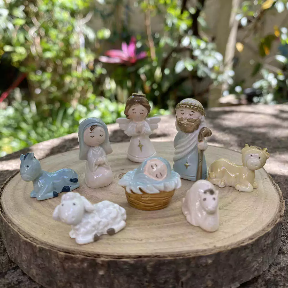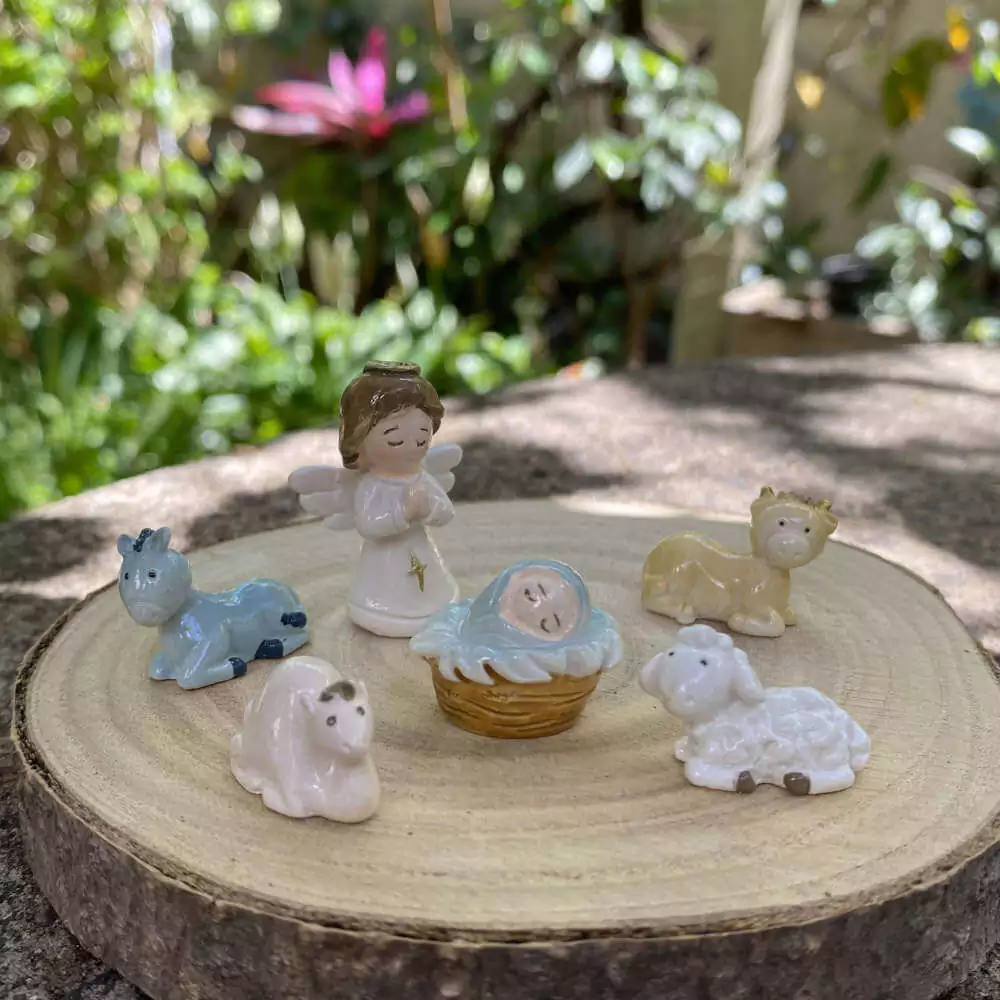 Presépio miniatura possui 11 peças: Maria, José, menino Jesus, os 3 reis magos, Anjo, 1 burrinho, 1 vaca, 1 ovelha e 1 camelo.