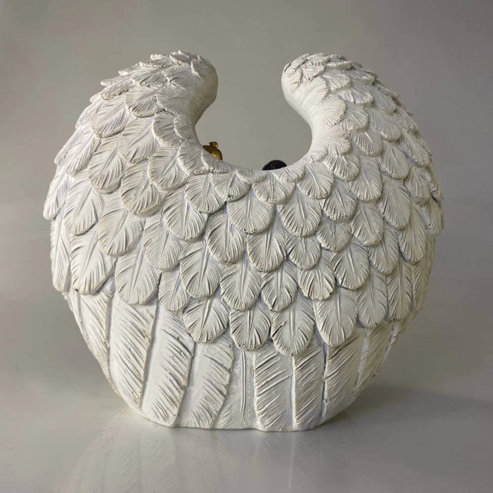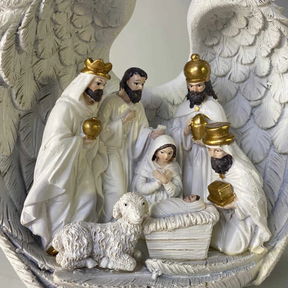 Presépio dentro de lindas asas representando anjos protegendo a Sagrada Família e os reis magos.