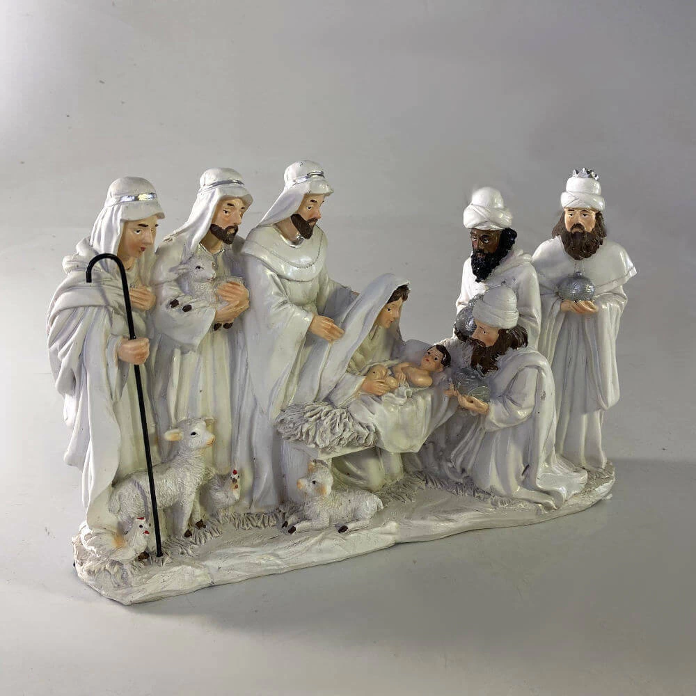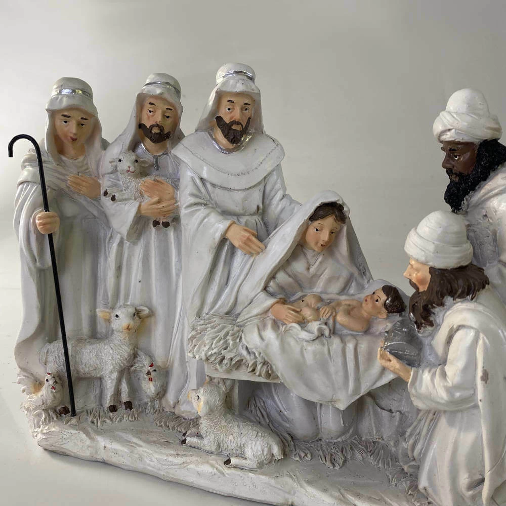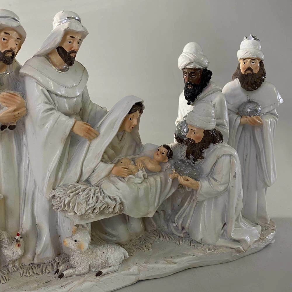 Este presépio em resina é uma peça única, grande e vistosa, ideal para quem deseja ter uma decoração natalina clássica e imponente.