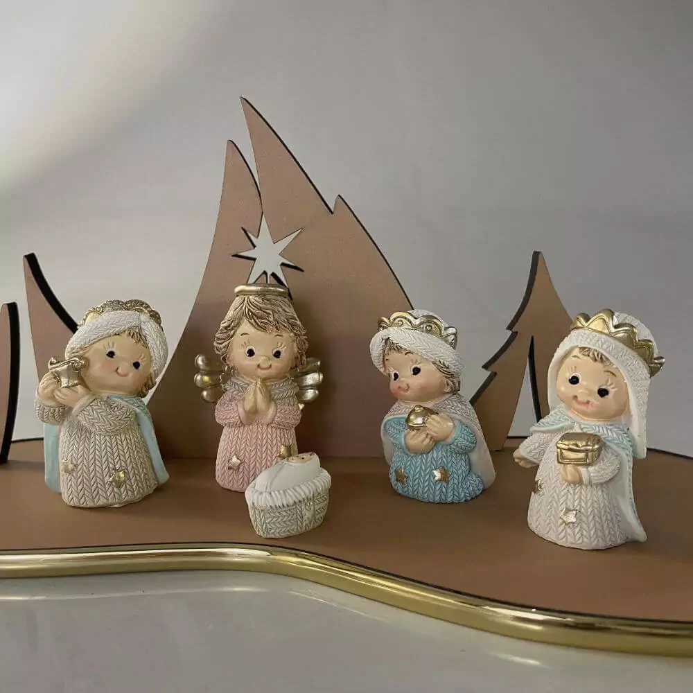 As peças cabem na palma da mão. Ideal para pequenos espaços ou para iniciar a tradição de montar presépio para as crianças.