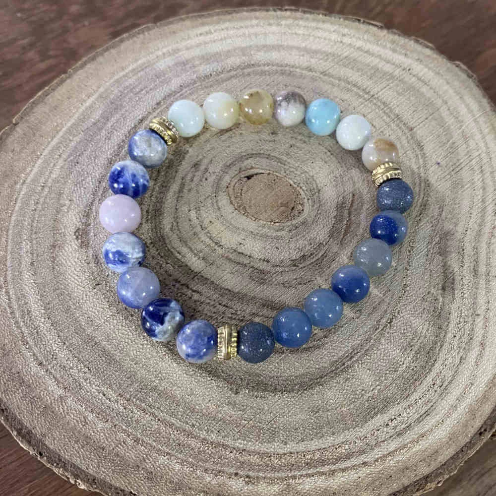A pulseira da Harmonia reúne três pedras naturais poderosas: Amazonita, Sodalita e Quartzo Azul. Com esferas polidas e acabamento suave, essa combinação foi pensada para promover calma, equilíbrio e verdade emocional.