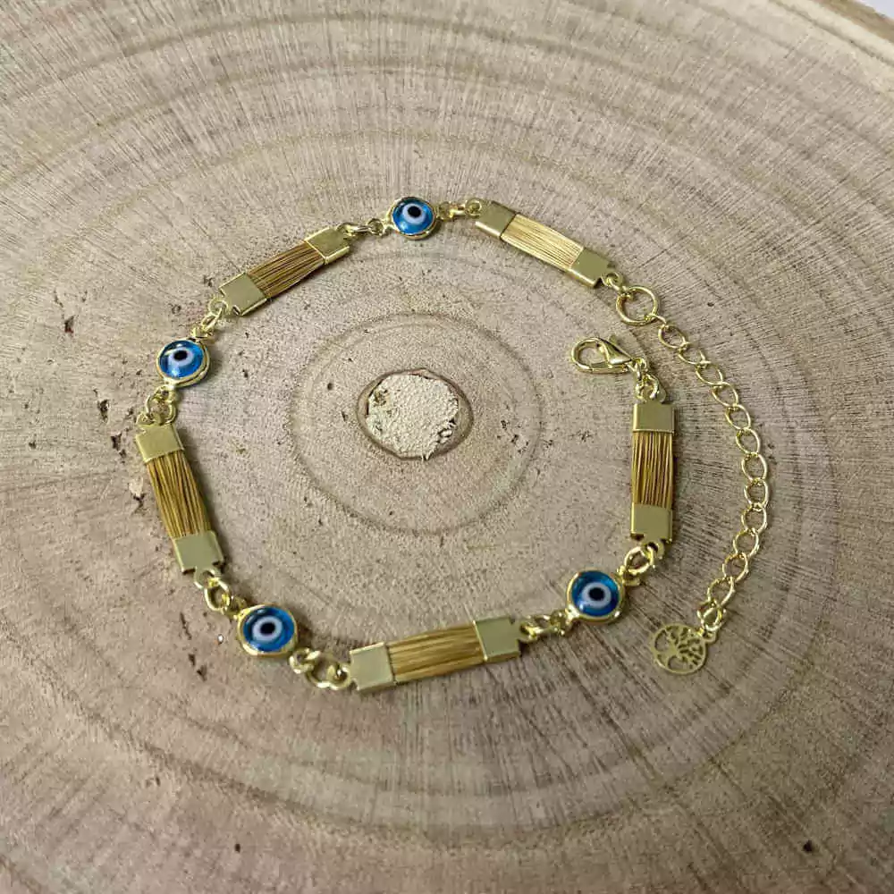 Pulseira feita com capim dourado e olho grego. Mini murano de olho grego.