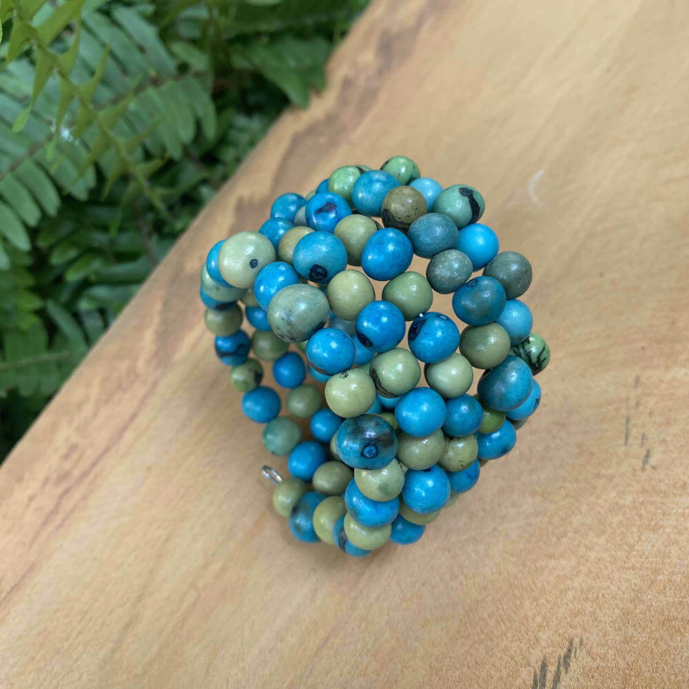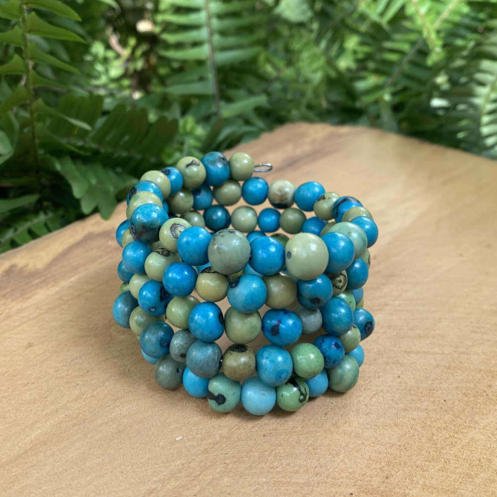 Em tons de azul e verde, a peça transmite frescor, leveza e energia positiva. A base em arame de mola é totalmente flexível, se adaptando ao formato e à espessura do braço, proporcionando conforto e versatilidade no uso.