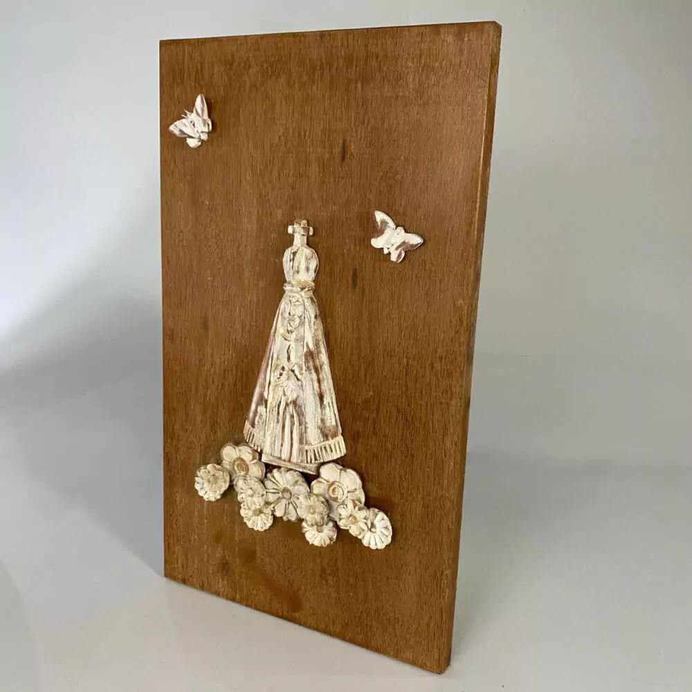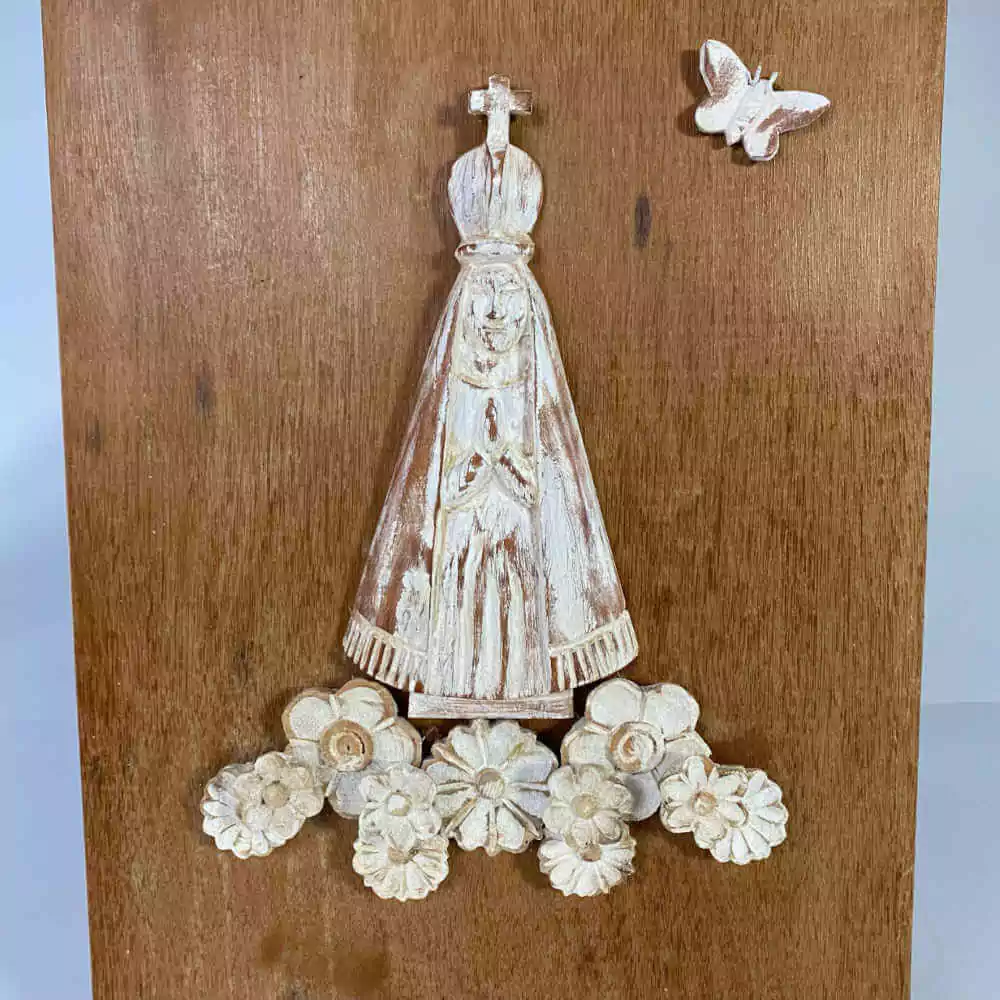 Imagem de Nossa Senhora Aparecida entalhada na madeira, flores e borboletas.