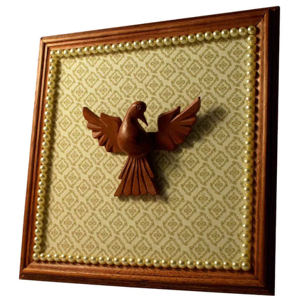 Quadro de Divino Espirito Santo em madeira entalhada, peça de fabricação própria. Montamos sob encomenda no tamanho e cor que desejar. Entre em contato para mais informações.