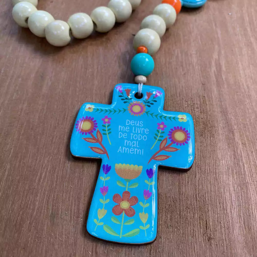 Destaque para a cruz que possui a mensagem "Deus Me Livre de Todo Mal Amém".