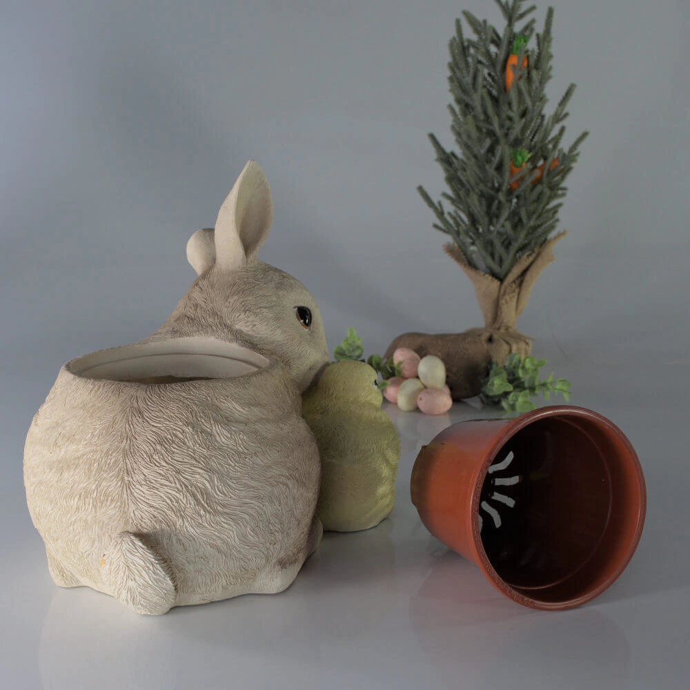 Cachepot feito de resina em formato de coelho com seu amigo pintinho ao lado.